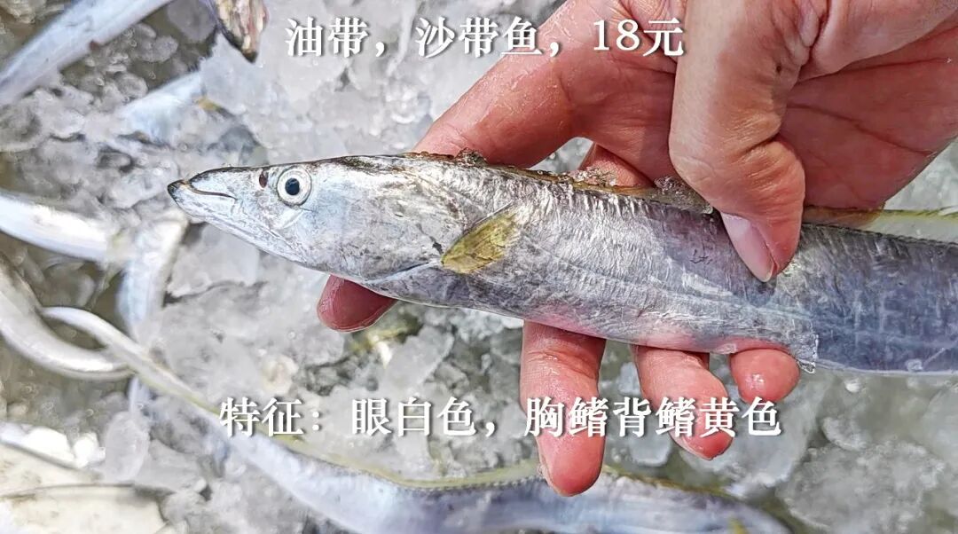南海的带鱼都不怎么好吃,但沙带鱼例外,它鲜嫩滑,很美味。不过大规格的少些,小的适合清蒸、轻煮,煎就太薄了。沙带鱼的特征很明显,它的眼睛是白色的,胸鳍和背鳍是黄色的,独此一家。