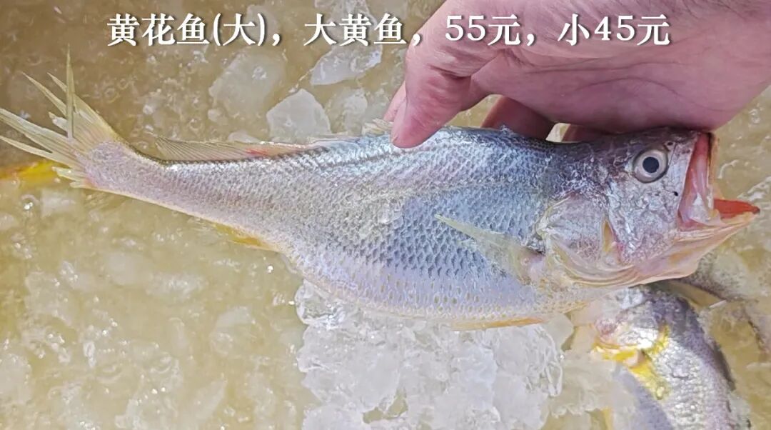 五、黄花鱼,野生大黄鱼,大55元/斤,小45元/斤。