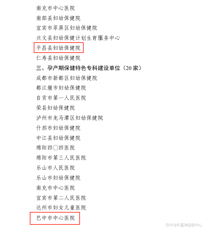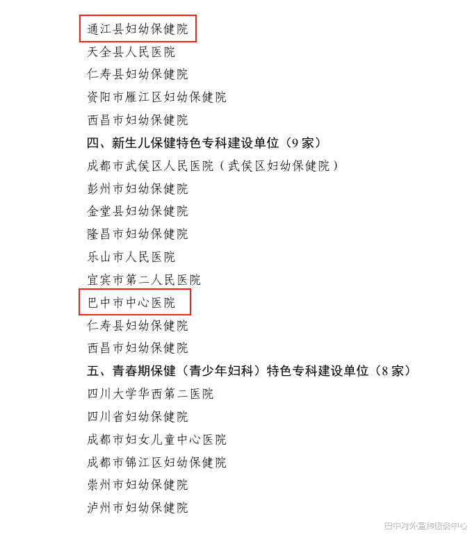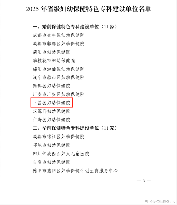 近日,四川省卫生健康委办公室印发《关于确定2025年省级妇幼保健特色专科建设(培育)单位的通知》(川卫办妇幼便函〔2025〕34号),巴中市中心医院(孕产期保健、新生儿保健)、平昌县妇幼保健院(婚前保健、孕前保健)、通江县妇幼保健院(孕产期保健)成功入选2025年省级妇幼保健特色专科建设单位。