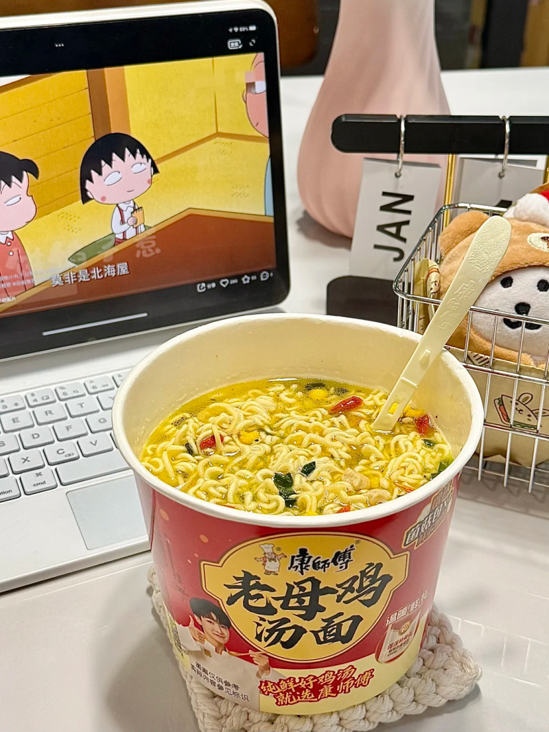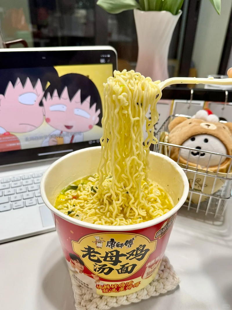周末窝在沙发上追剧,外面天气阴阴的,不想动也不想出门。这时候泡一碗康师傅老母鸡汤面最合适不过了。撕开包装,金黄的汤底、枸杞和虫草花浮在面上,热水冲下去,那股熟悉的香味就飘满了整个房间。等上三分钟,端起碗来先喝一口汤,温润、醇厚,从喉咙一直暖到胃里。不是冲鼻子的香精味,而是家里灶台上小火慢炖出来的那种醇厚感。一边追剧一边吃面,汤喝完了,剧还没追完,心里却是暖的。