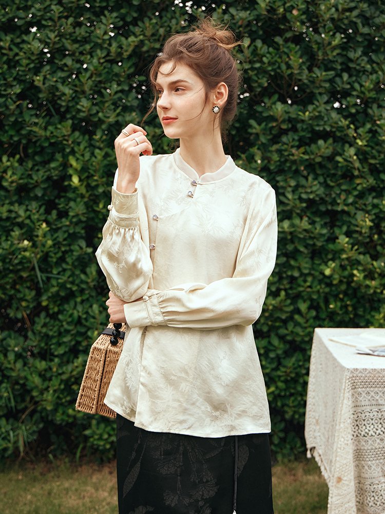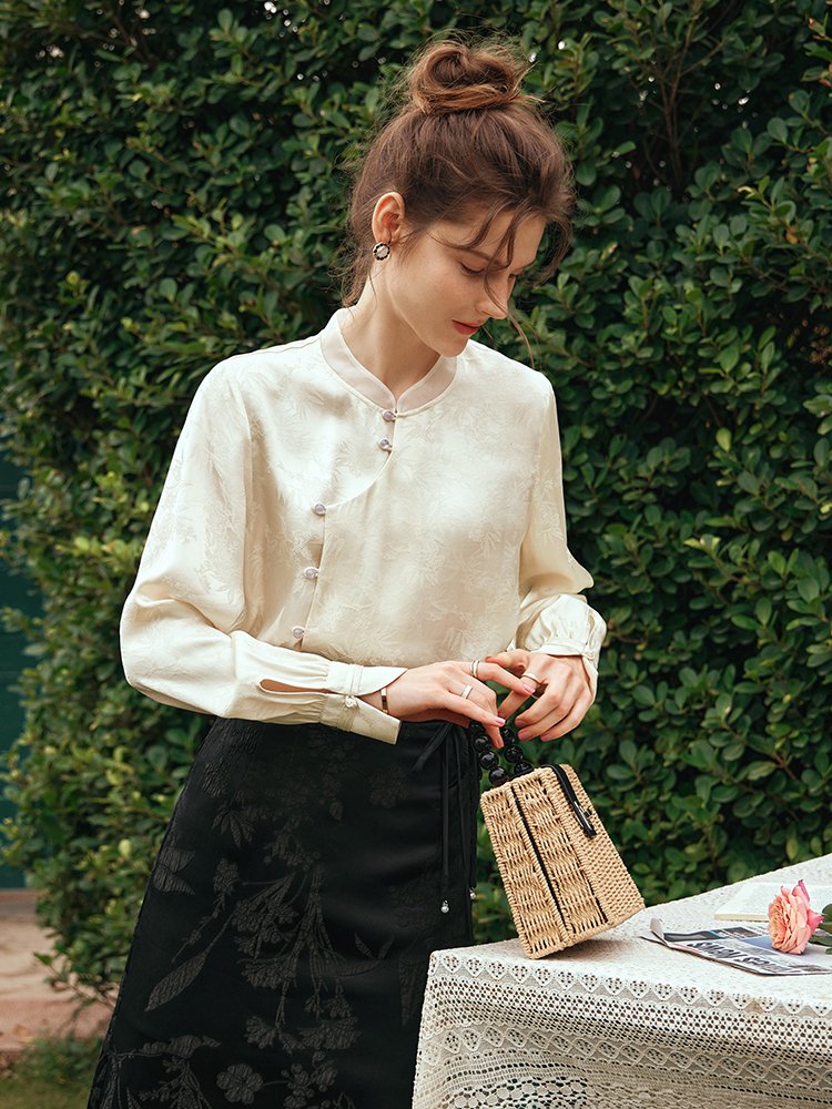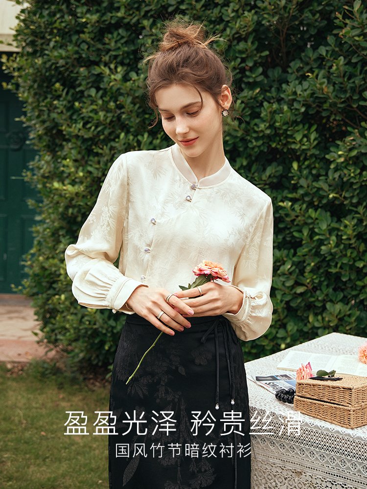 定制竹节暗纹梭织面料,丝滑顺垂,微光泽感;亲肤舒适,柔软透氣,品质感强,不易皱好打理;拼接立领设计,修饰脖颈线条,典雅从容;不规则斜门襟设计,定制玳瑁手缝树脂扣点缀;穿脱方便,契合新中式主题,品位升级;正肩版型优化头肩比,袖克夫+精至盘扣开合