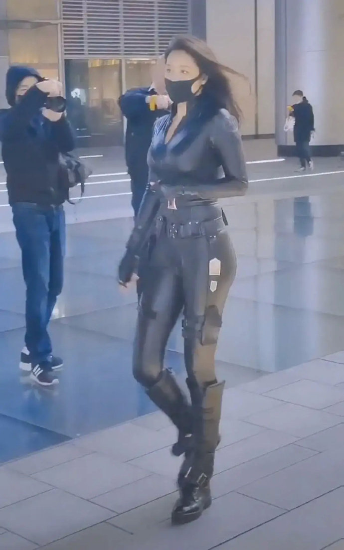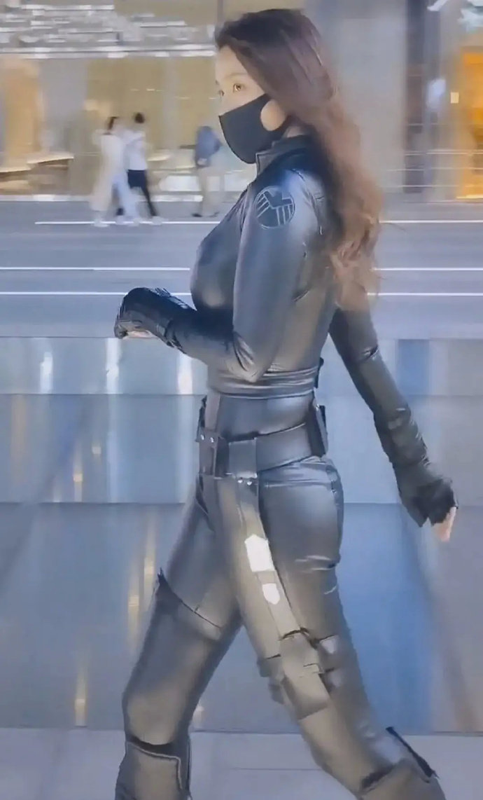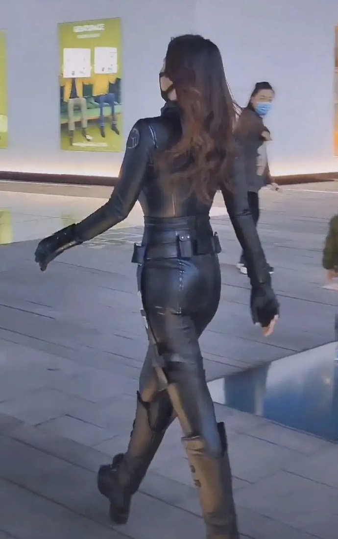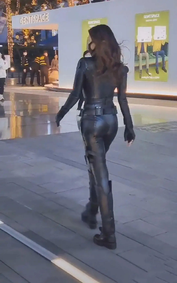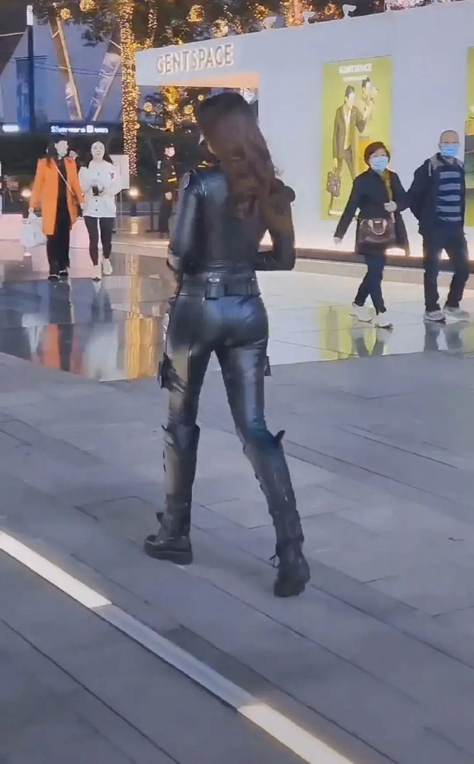 画面中,只见这位美女一头披肩长发,带着黑色口罩,身形高挑,气质出众。最引人注意的是女孩的一身皮衣,皮夹克,皮裤,皮靴一应俱全,就就是从美国电影大片里走出来的女孩,甚至连路过的老外都被吸引住了,忍不住对着女孩拍照。