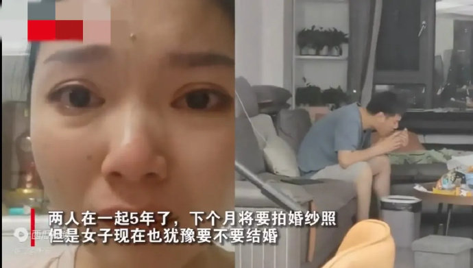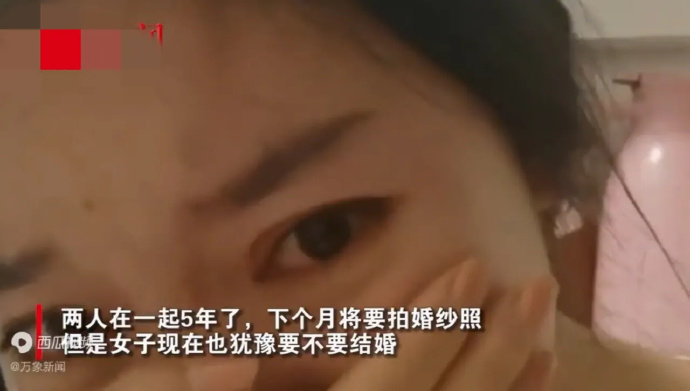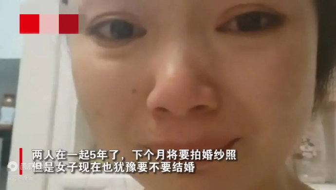 女子越想越委屈,一边哭泣,一边思考,两个人在一起5年了,下个月就要拍婚纱照了,女子现在也犹豫要不要结婚。