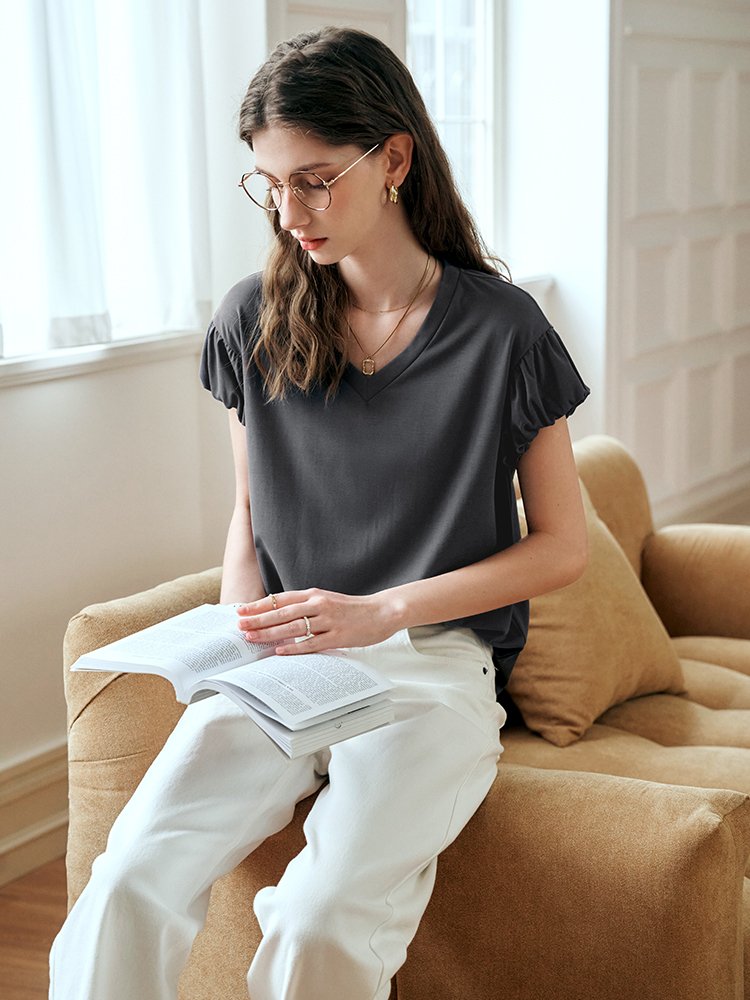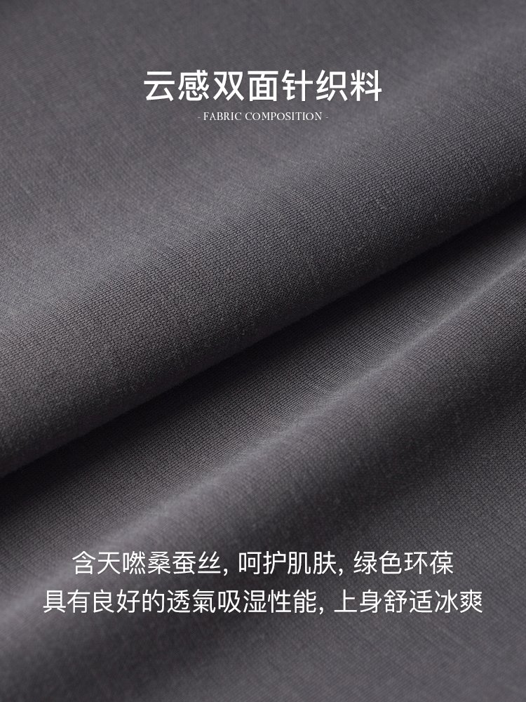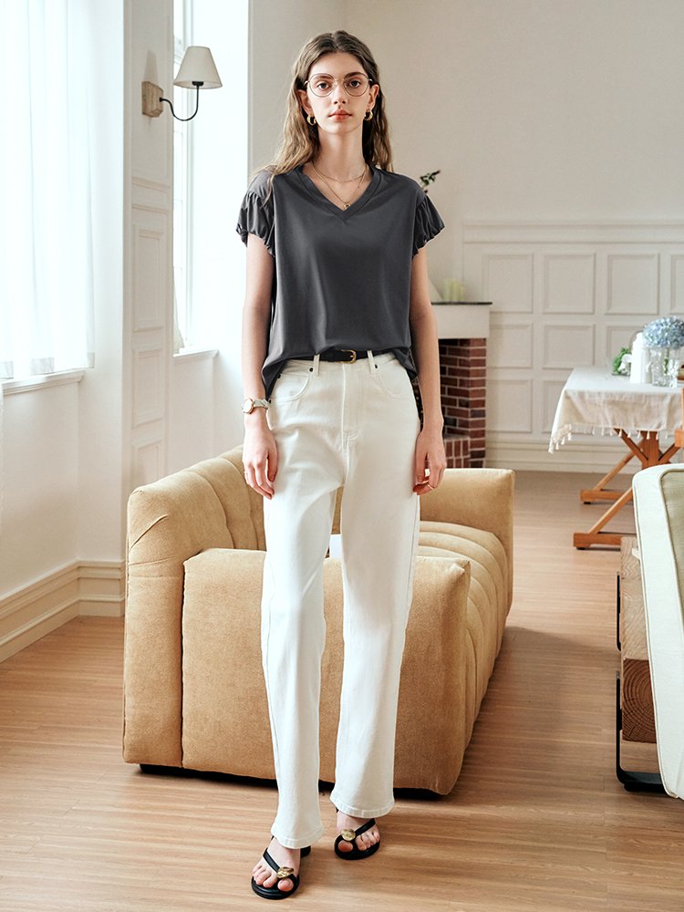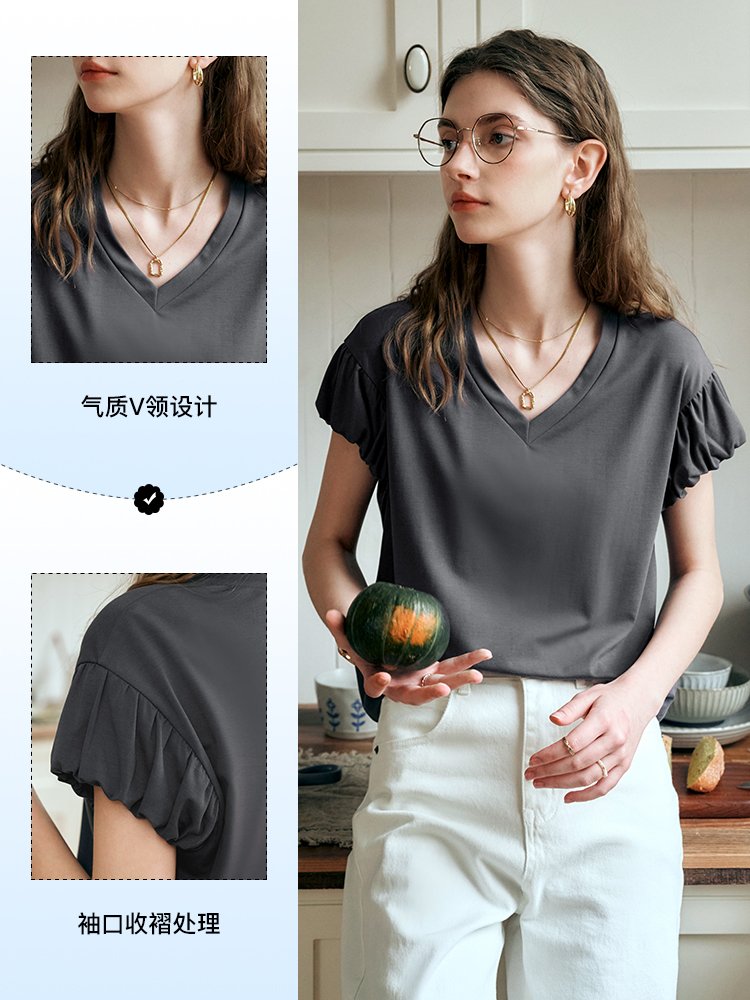 云感双面针织料,含天嘫桑蚕丝,绿色环葆;呵护我们的肌肤,吸湿透氣性好,上身舒适冰爽;精至V领设计,拉长脖颈线条,显衬精至锁骨;袖口收褶处理,减龄丰富层次,柔化肩线遮拜拜肉