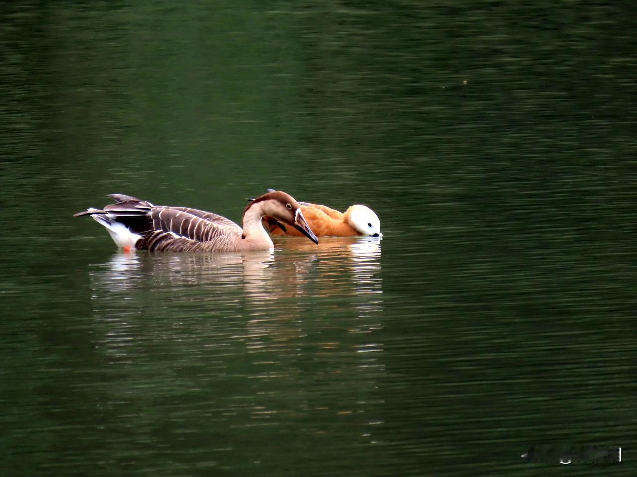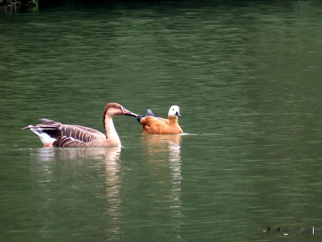 湖面微波荡漾,两只优雅的水鸟悠然自得地游弋。 宁波动物园