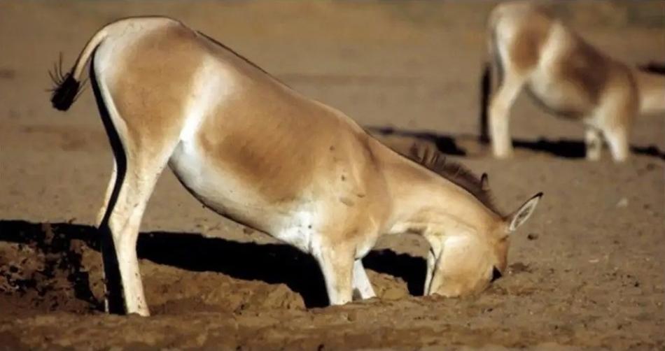 有时候遇上干旱的季节,藏野驴还会跑到河湾地带,选择一处地下水位较高的区域,不断用前蹄刨土,刨出一个半米深的坑洼,直到地下水渗出形成一个小水坑。
