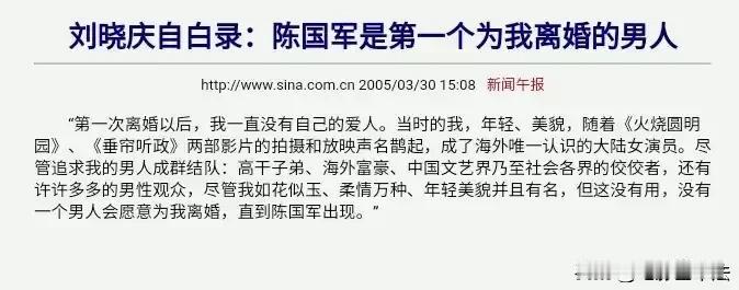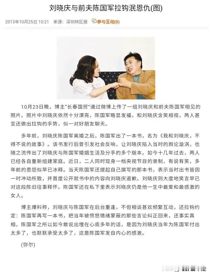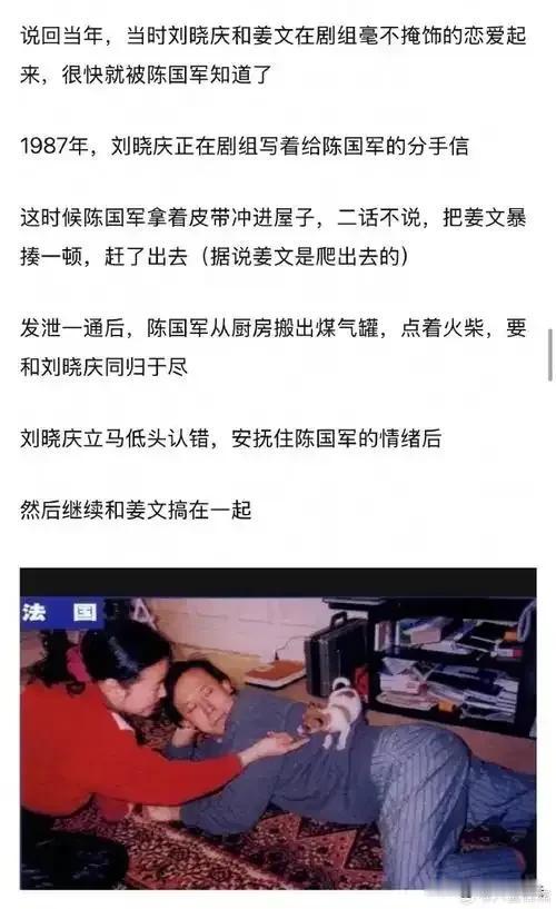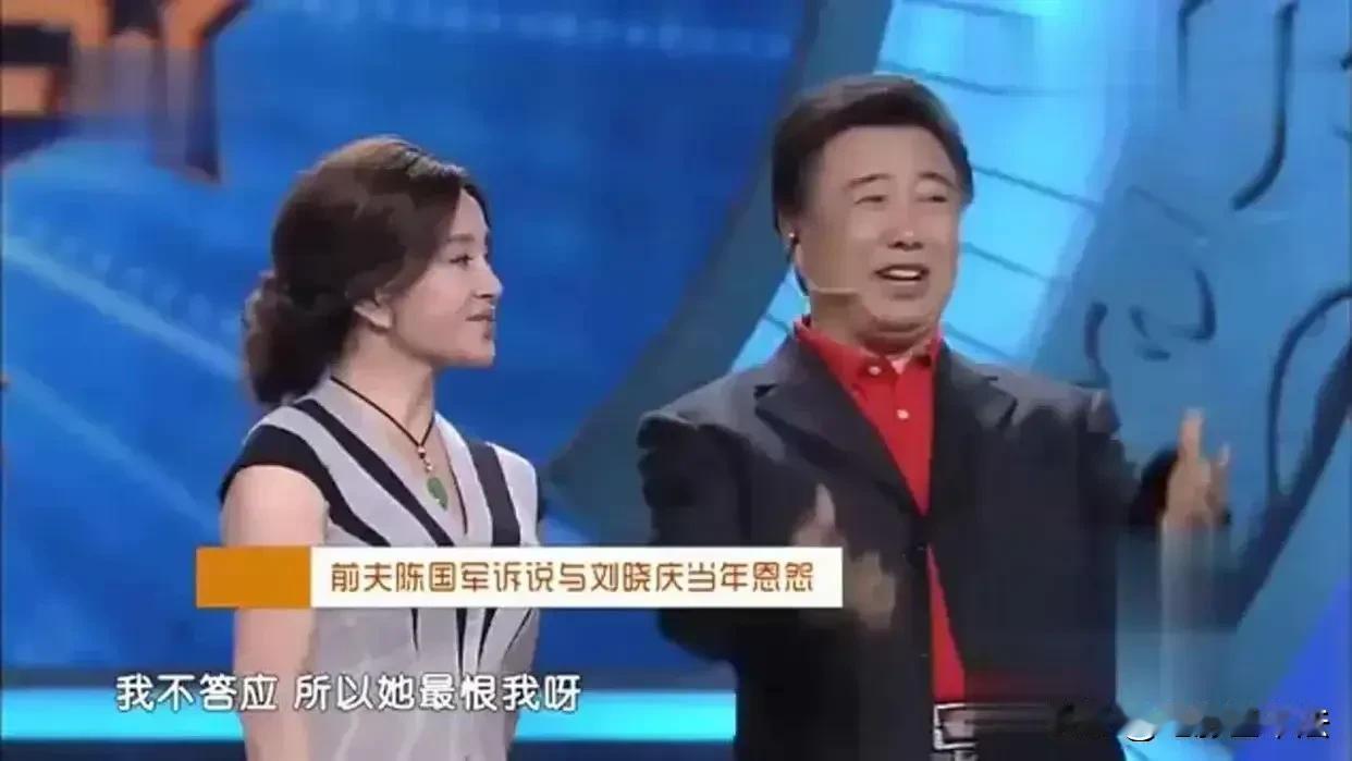 刘晓庆第二任丈夫陈国军刚开始和刘晓庆交往时是已婚身份,因此刘晓庆非常自豪的当众宣布“陈国军是第一个为我离婚的男人。” 两人结婚后刘晓庆又和当时的当红小生,22岁的姜文保持着两性关系,陈国军知道后非常生气,然后捉奸成功,并强迫姜文写下了和刘晓庆的交往过程。 而后虽然刘晓庆再三保证,但是陈国军发现刘晓庆不是出轨,而是从来不在轨道上,于是两人离婚,大概是都觉得有些丢人,离婚时两人互相承诺不对外界透露两人交往细节。 但是刘晓庆很快就写了一本自传详细描述了和陈国军交往的各种细节,比如陈国军曾经多次躲在刘晓庆房间的衣柜里等等,书里把陈国军写的很猥琐,陈国军气的也写了一本自传,书中同样把刘晓庆描述的一无是处,并详细描述了他捉奸刘晓庆姜文,暴打姜文,刘晓庆求饶等各种细节。 此后两人关系彻底破裂,而后两人各自又重新组建家庭,没想到两人离婚后16年,也就是2015年,两人突然冰释前嫌,并共同出席了河北卫视的综艺节目《明星同乐会》。 虽然当时两人都已经各自结婚,但是陈国军先是为当年写自传的事向刘晓庆道歉,而后表示自己依然爱着刘晓庆,刘晓庆是他这辈子唯一全身心爱过的人,还说刘晓庆是个伟大的女人,这个伟大的女人值得一个男人终生去爱她。 备注: ①刘晓庆自传,《我的自白录——从电影明星到亿万富姐儿》。 ②陈国军自传,《我和刘晓庆,不得不说的故事》。 ③姜文描述和刘晓庆交往过程: “一九八七年在苏州拍戏,我和刘晓庆开始建立恋爱关系。(包含两性关系) 一九八七年底,我得知她已正式嫁人后,仍继续追求她,保持这种关系。”