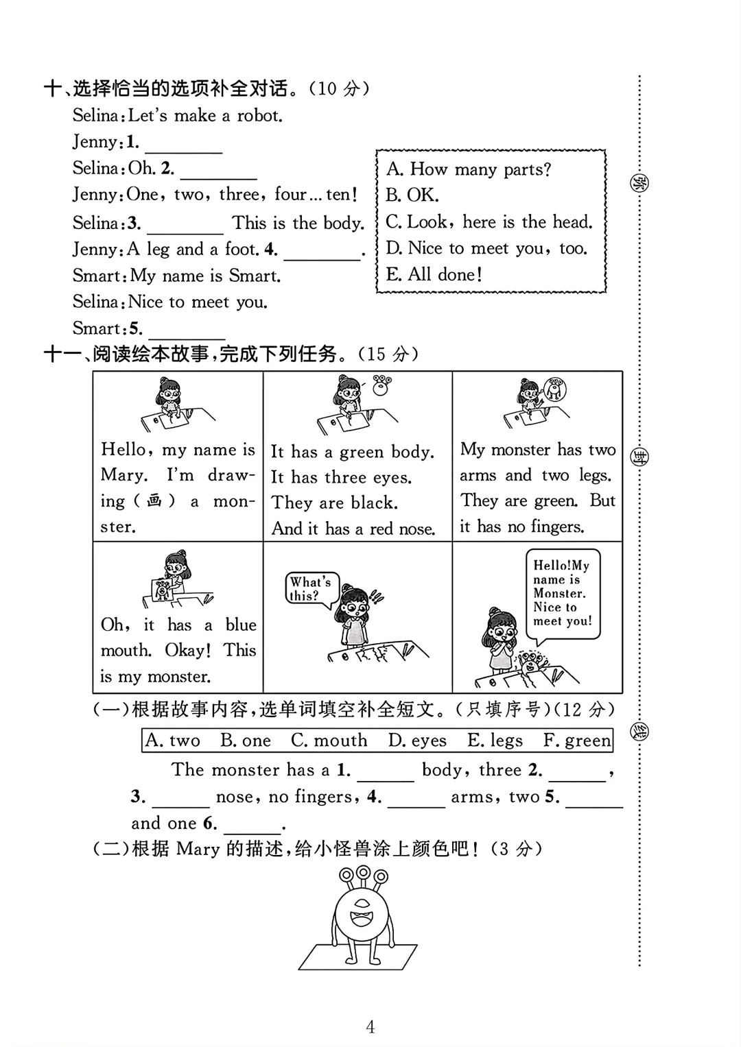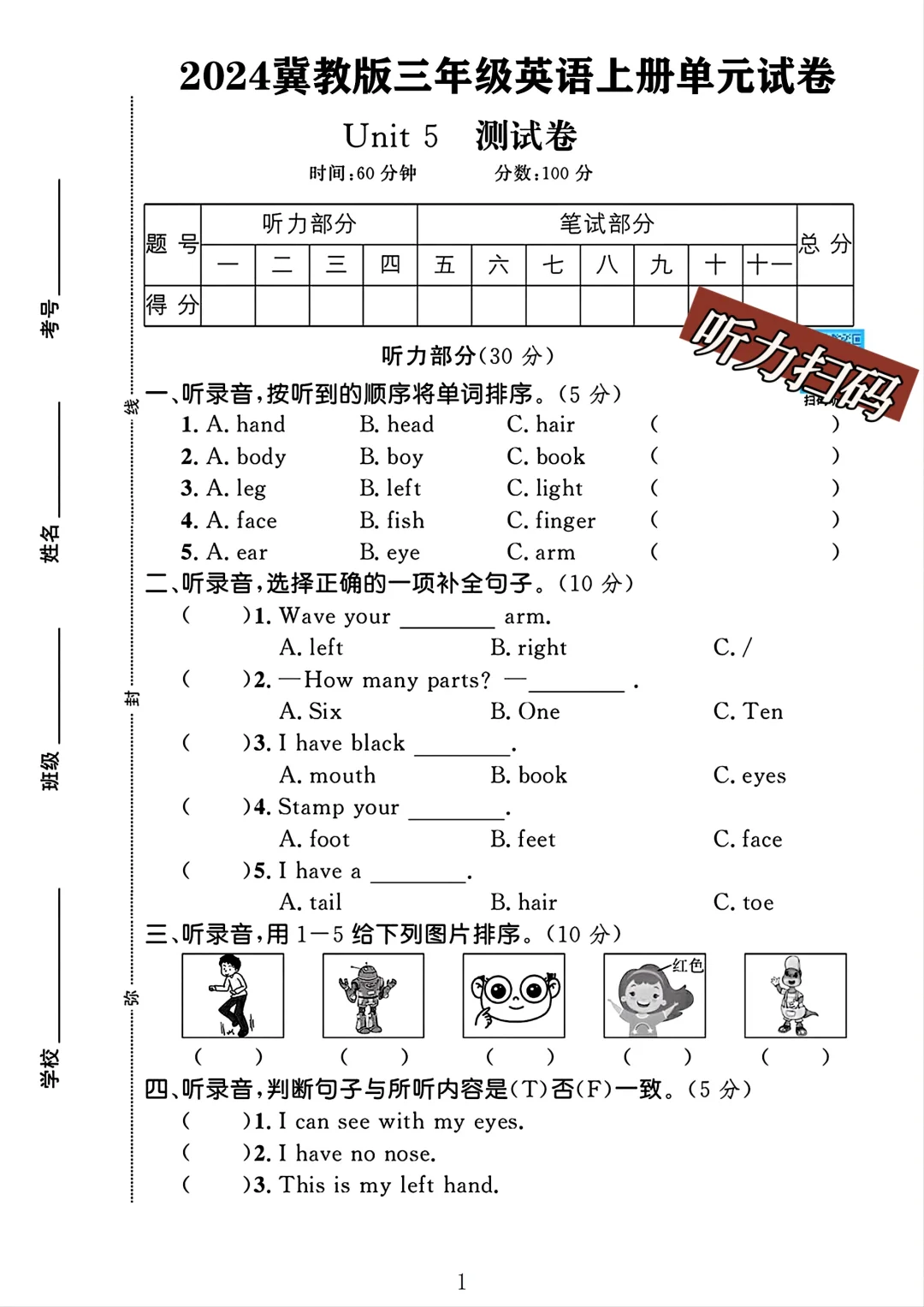 冀教版 三年级上册英语 单元测试 第五单元测试 电子版可打印 试卷