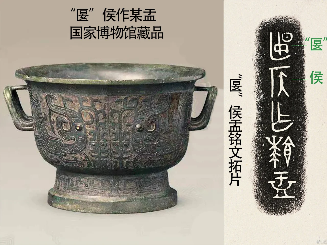1、图二,喀左窖藏器,”匽”侯盂铭文:”匽”侯作某盂。