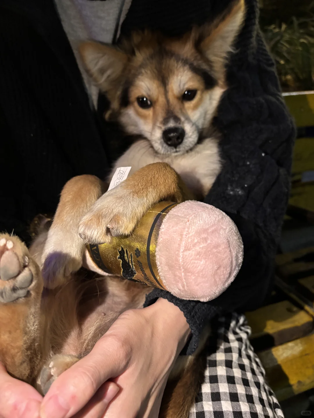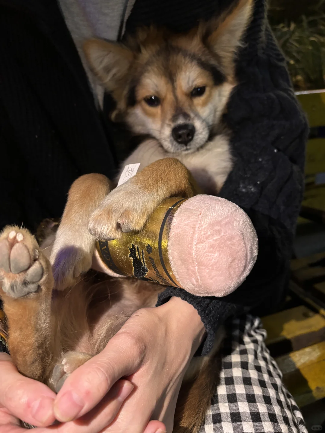 女友给小黑买了狗玩具,一个粉色的毛绒香槟瓶子,捏起来会发出声响。