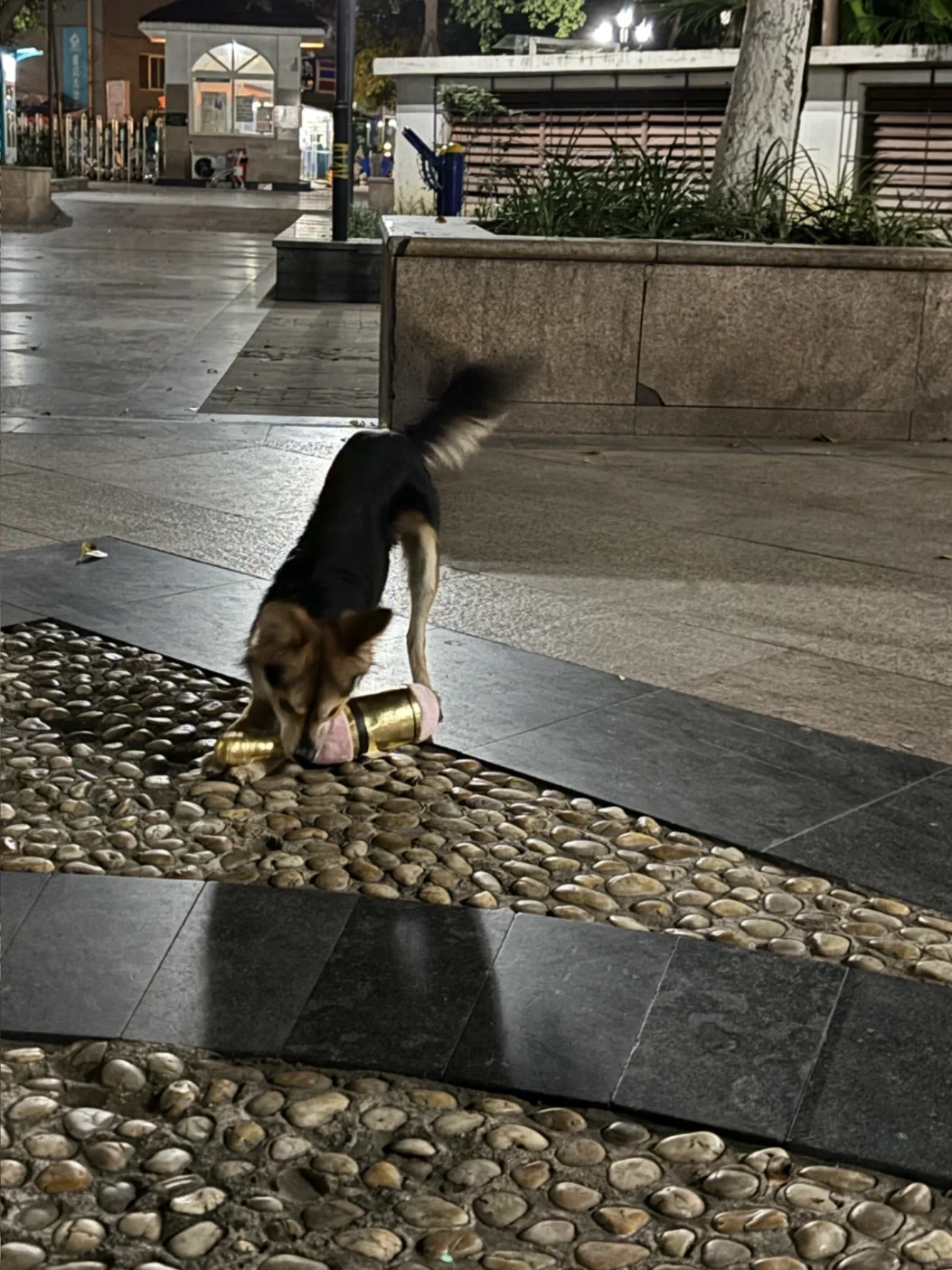 几次下来小黑没累,我已经先累了。在我们往家走的时候,小区的流浪三花猫花花出现了,为了避免猫狗大战,我赶快把玩具扔了出去吸引他的注意力,