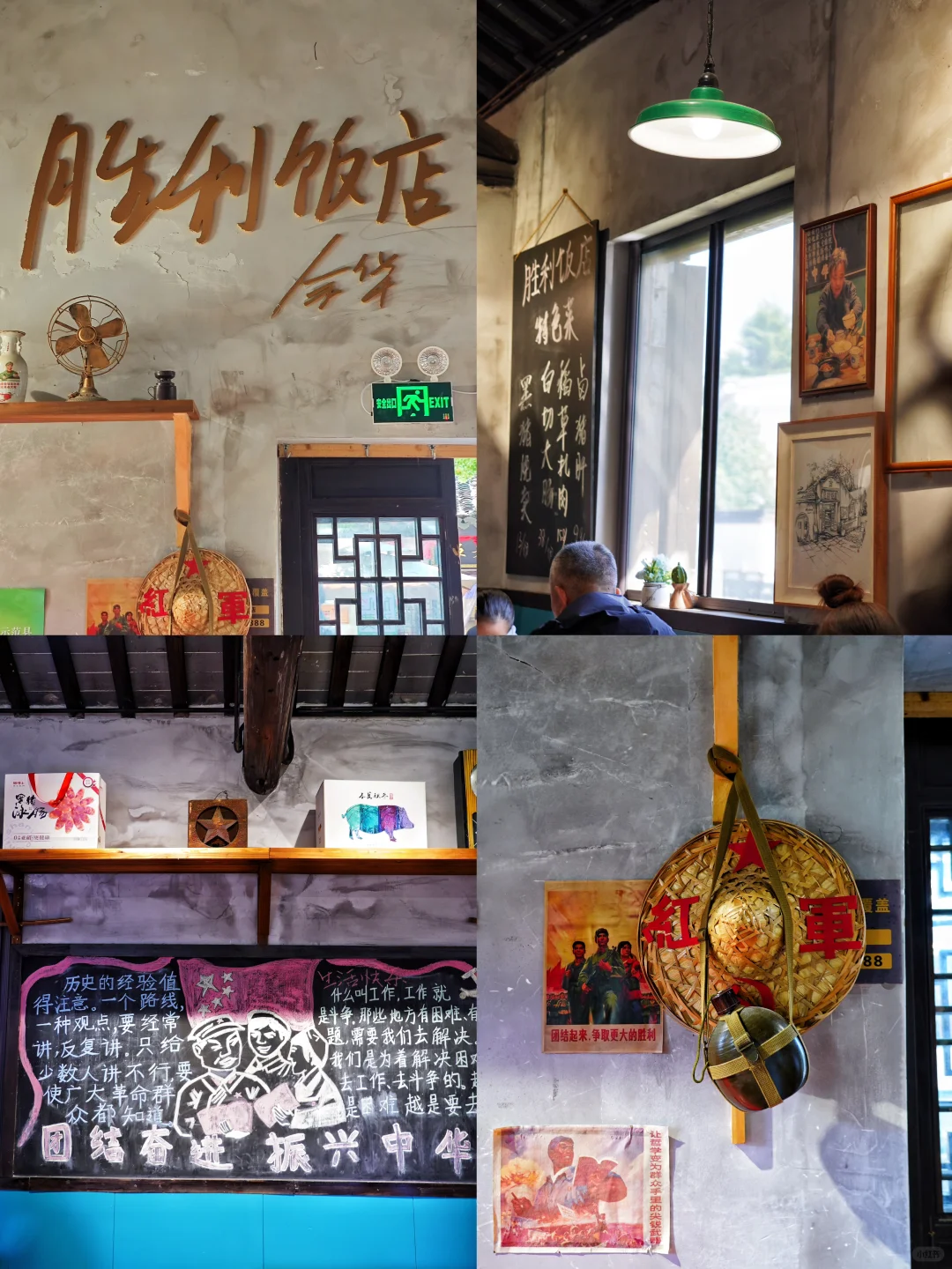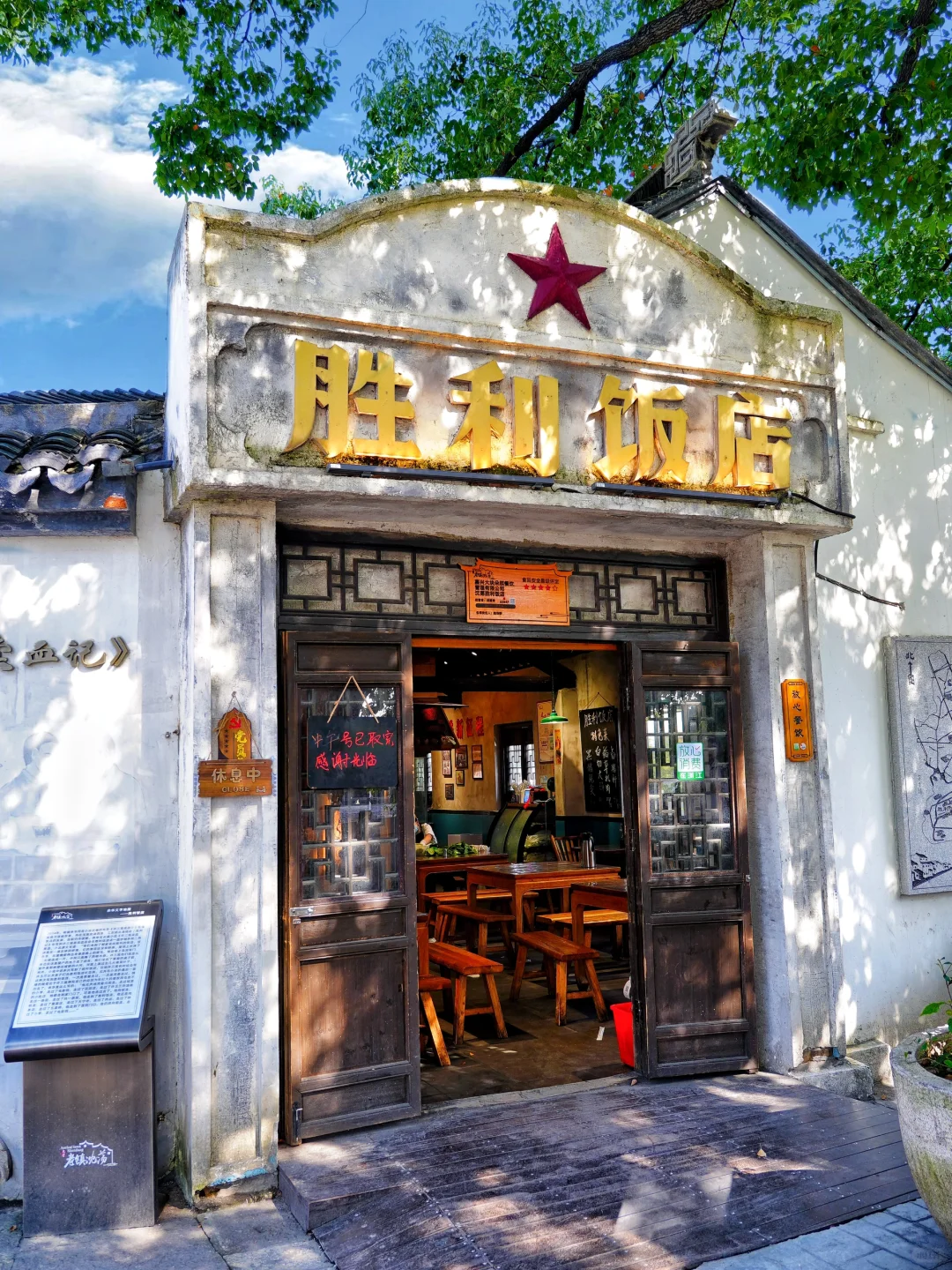 1️⃣胜利饭店:余华《许三观卖血记》的原型场景。饭店坐落在石桥边,门前的香樟树影和白墙黑瓦相互辉映,意境特别美。现在也是古镇内的网红餐馆,“雪菜炒猪肝”是必点,过去吃饭建议先去取号。
