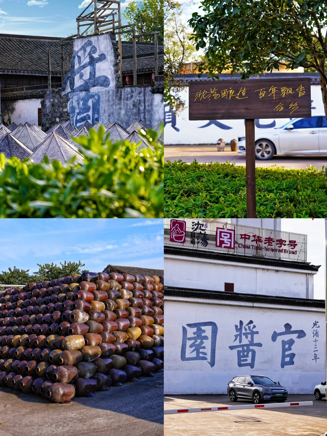 导航“海盐沈荡酿造有限公司”,进厂参观需要扫码登记,门口文创店还能买到酱油牛乳雪糕(18r/支)。漫步在厂房能闻到酒窖散发出的老酒香🍸,厂区里堆积如山的酒坛子很壮观,还能看到百年酱油晒场真实的晾晒酱油场景。