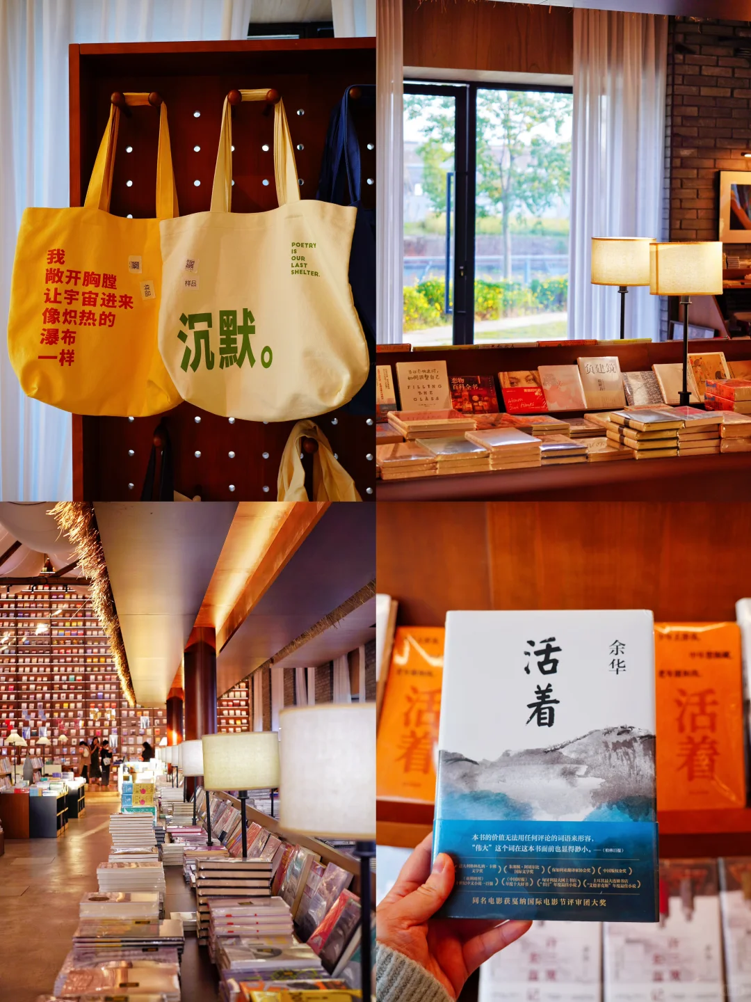 1️⃣构想几何谷仓书店:书店构造空间感很强,店内布置别有用心,日落时分阳光洒进书店特别美。书籍分类也很多,满满都是余华老师的元素作品,平时人不多,可以安静地看书。