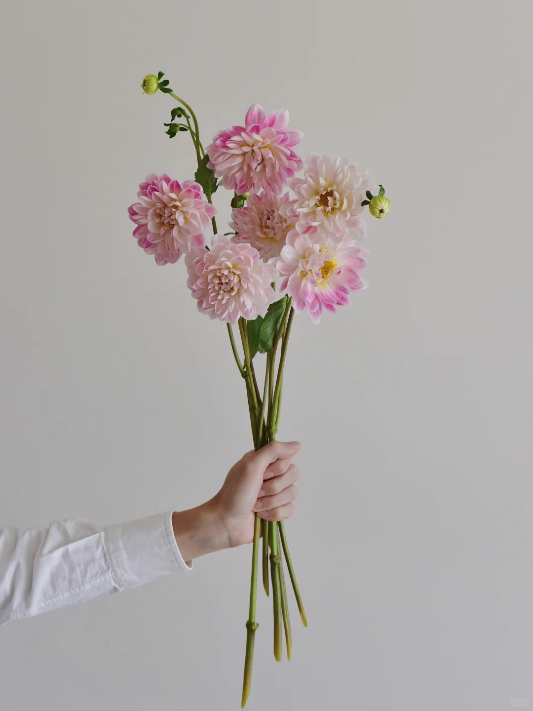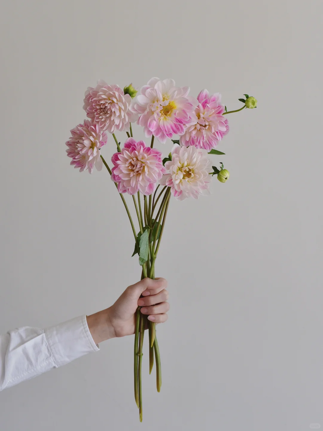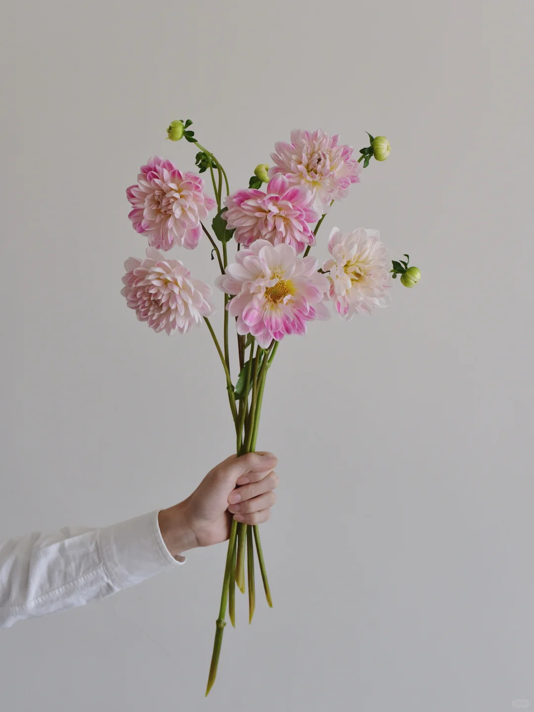 很好看的莲花花型大丽花,花瓣白里透粉,像手动涂抹的蜡笔画。