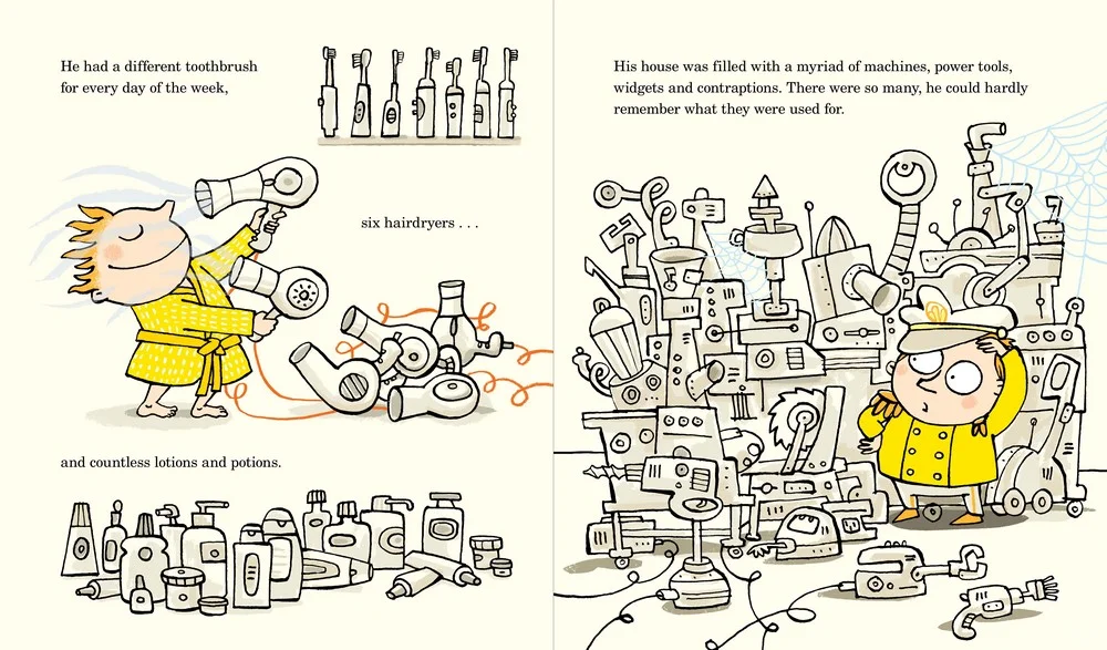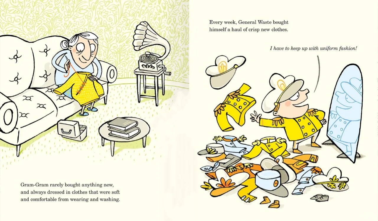比如说,他有成排的牙刷、无数的盥洗用品,每天他都能换不同种商品来用。他的家里还堆满了各种机器、零件,因为有太多了,他甚至不记得哪些可以用,哪些不能用。同样的,浪费将军也有不健康、不环保的饮食、穿衣习惯;食物只吃一口就不吃了,衣服穿完一次就丢在一旁。浪费将军看起来毫不在意「浪费」的问题。