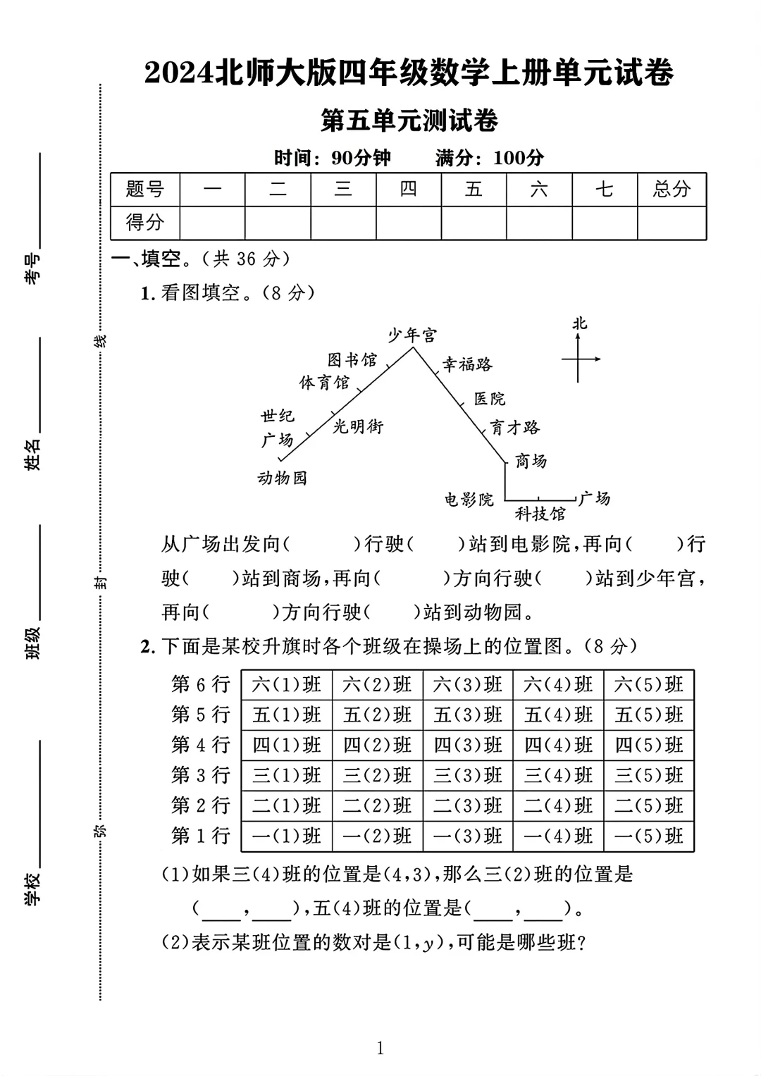 北师大版数学 四年级上册数学 单元测试 第五单元测试卷 电子版可打印 试卷