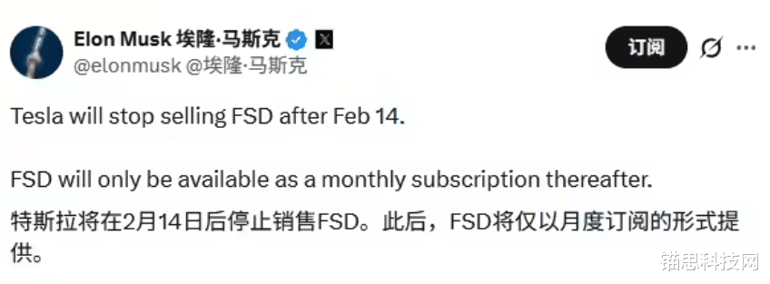 1月14日消息,特斯拉CEO埃隆·马斯克通过社交媒体平台X发文宣布,特斯拉将自2月14日后正式停止销售FSD(全自动驾驶)功能,此后该功能将仅以月度订阅形式向用户提供。这一决策标志着特斯拉彻底重构FSD的商业模式,从“一次性购买+后续升级”的传统模式,全面切换为纯订阅服务模式。
