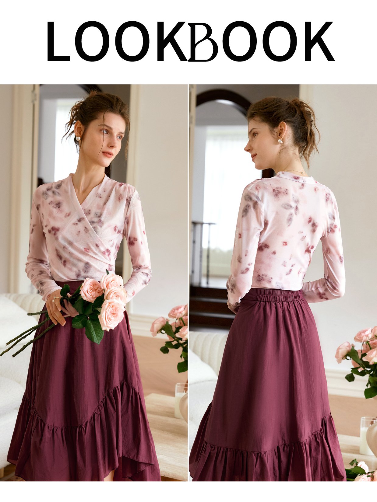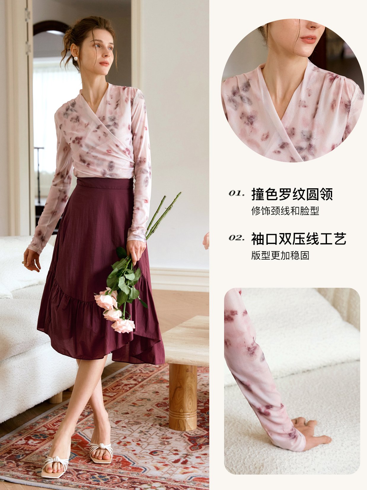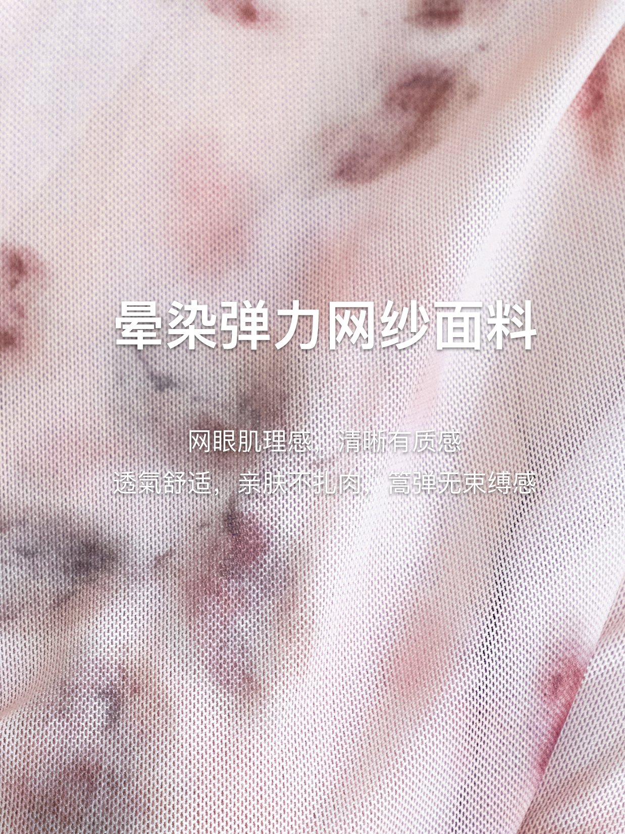 晕染弹力网纱面料,亲柔不扎肤,舒适透氣性好;宛如人体的DI二道肌肤,高劲高弹力,包容性强;衣身晕染工艺,避免走光尴尬的同时,显白提气;显瘦V领,交叠门襟设计,修饰锁骨,凸显天鹅颈