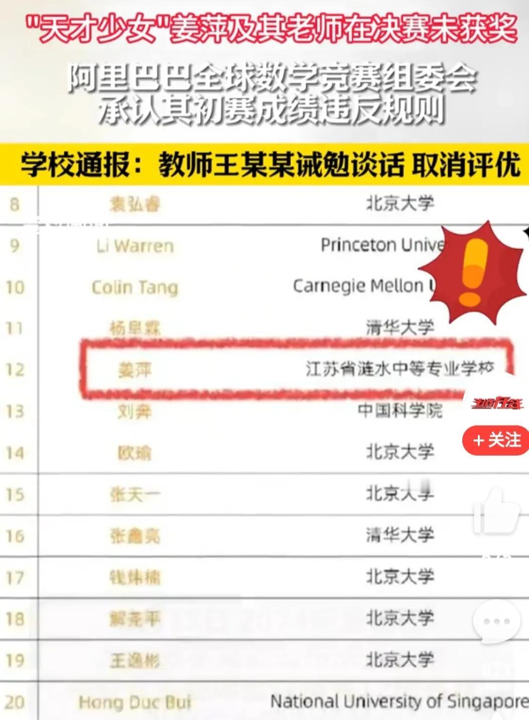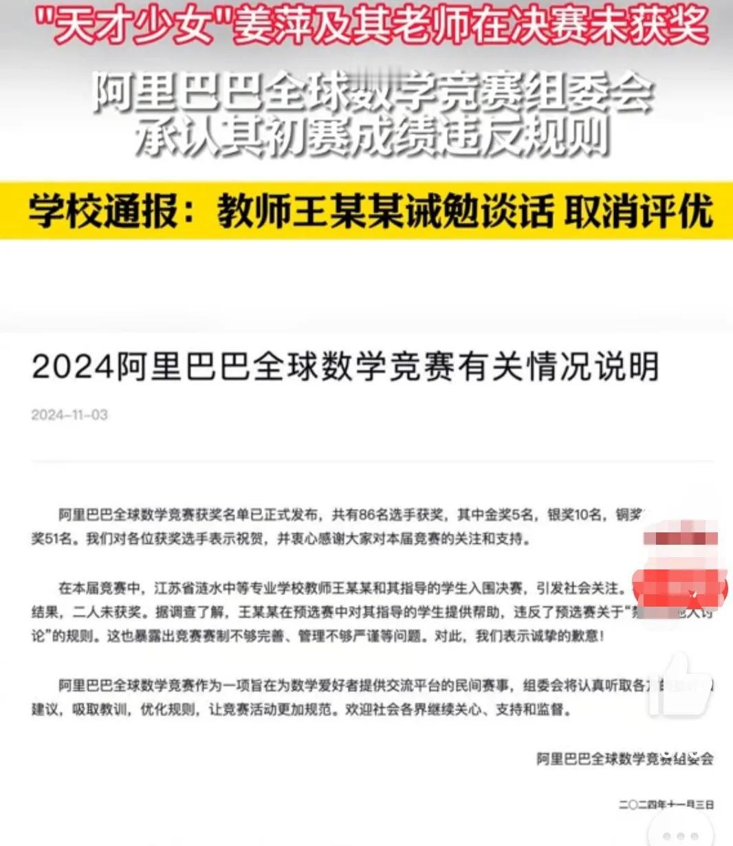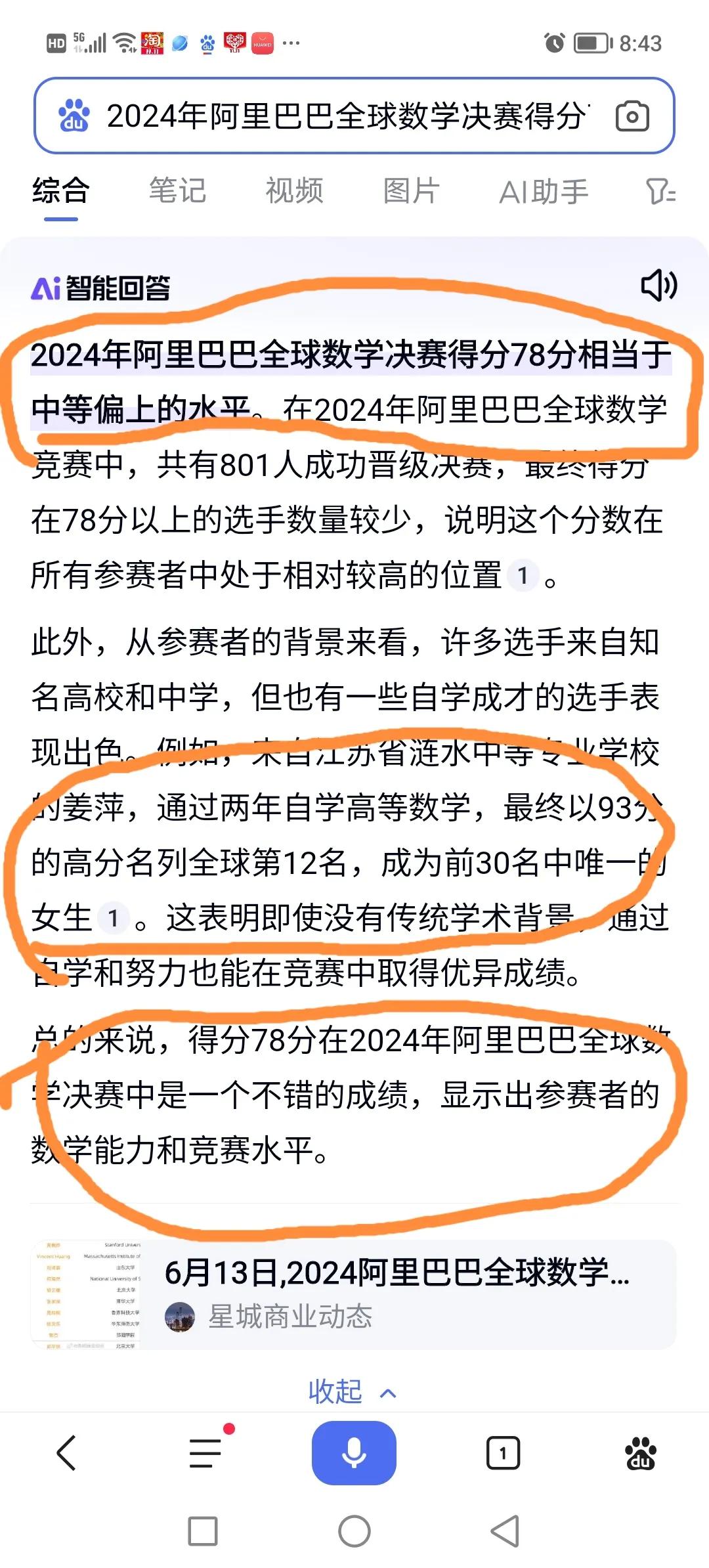 如果网传姜萍决赛成绩78分为真,处于决赛801选手的中上等位次,您还有什么话要说吗? 据传2024年阿里巴巴全球数学竞赛决赛中姜萍得分78分,参加本次数学决赛801人,获奖86人,姜萍未获奖。此前,姜萍在预选赛中以93分,全球第12名进入决赛,引发舆论关注。姜萍决赛成绩78分在800多位选手中处于中上等水平,因为超过70分以上的选手并不多。对此,您有什么看法想分享吗?