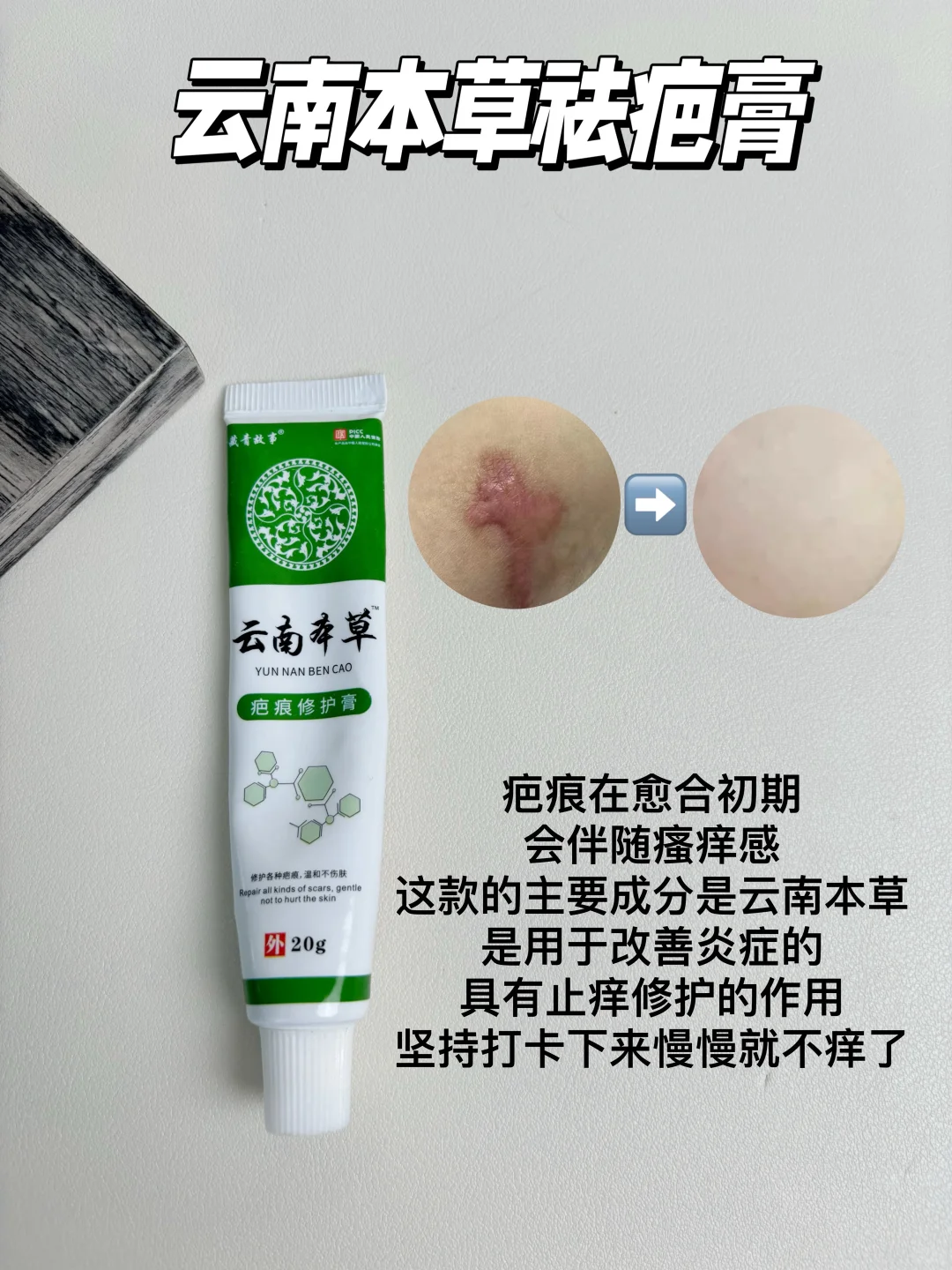 疤痕在愈合初期会伴随瘙痒感,这款的主要成分是云南本草,是用于改善炎症的,具有止痒修护的作用,坚持打卡下来慢慢就不痒了。