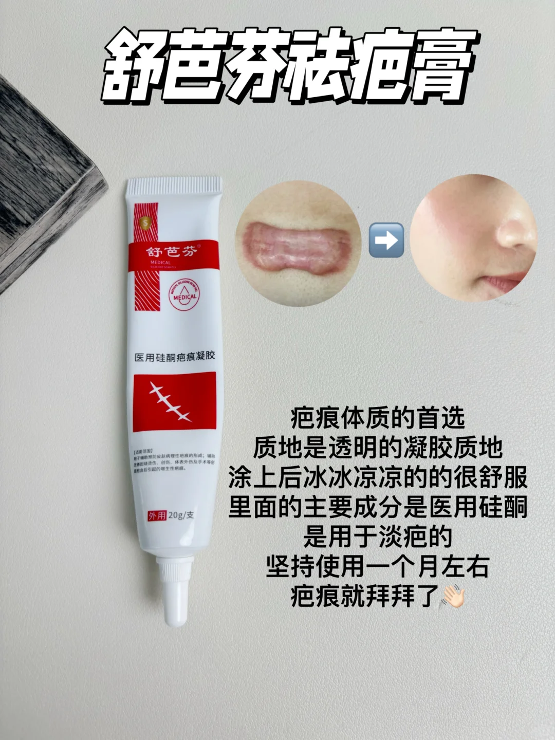 疤痕体质的首选,质地是透明的凝胶质地,涂上后冰冰凉凉的很舒服,里面的主要成分是医用硅酮,能起到淡疤的作用,坚持使用一个月疤痕就拜拜啦。