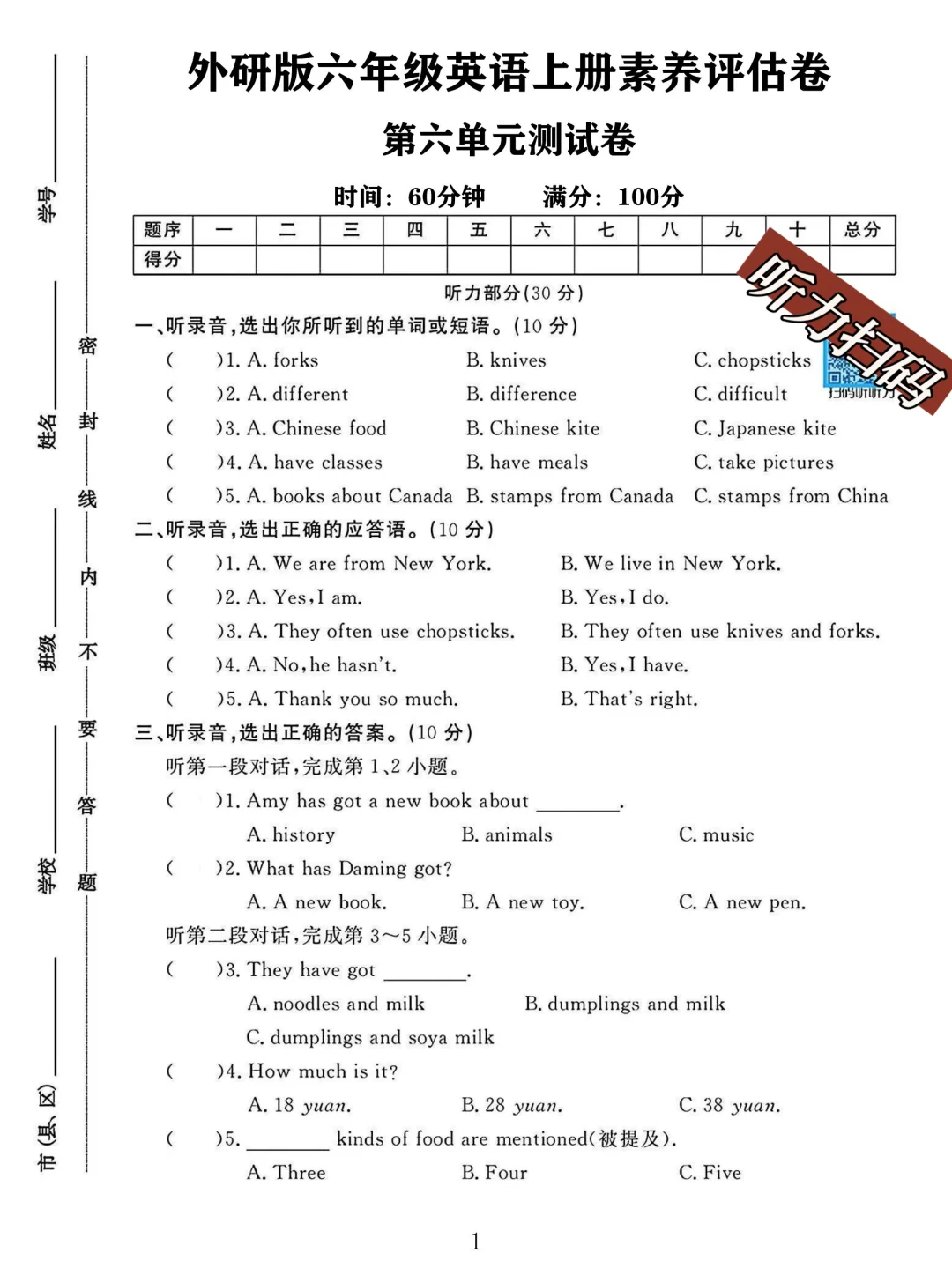 外研版 六年级上册英语 第六单元测试卷 单元测试 电子版可打印 试卷
