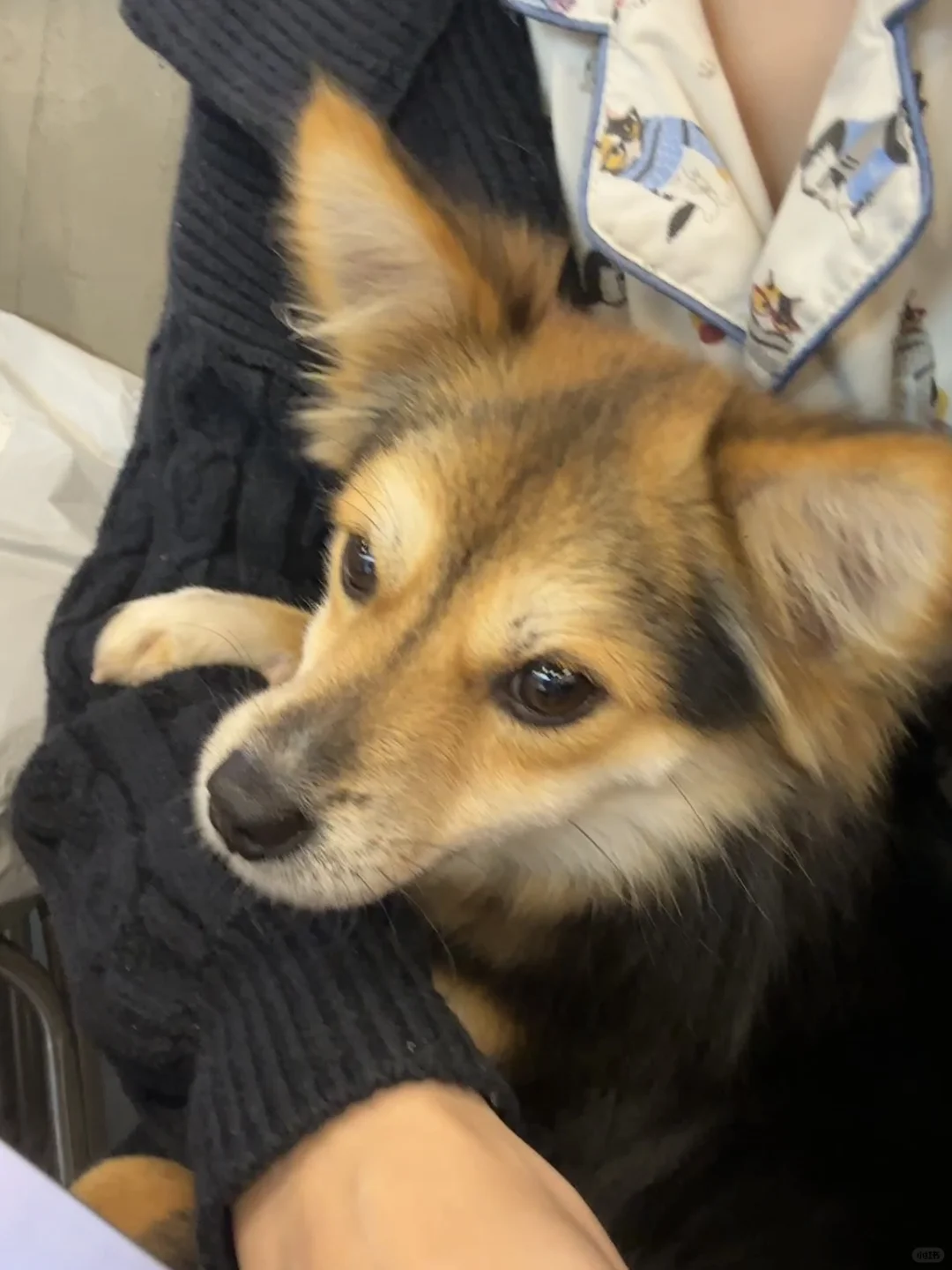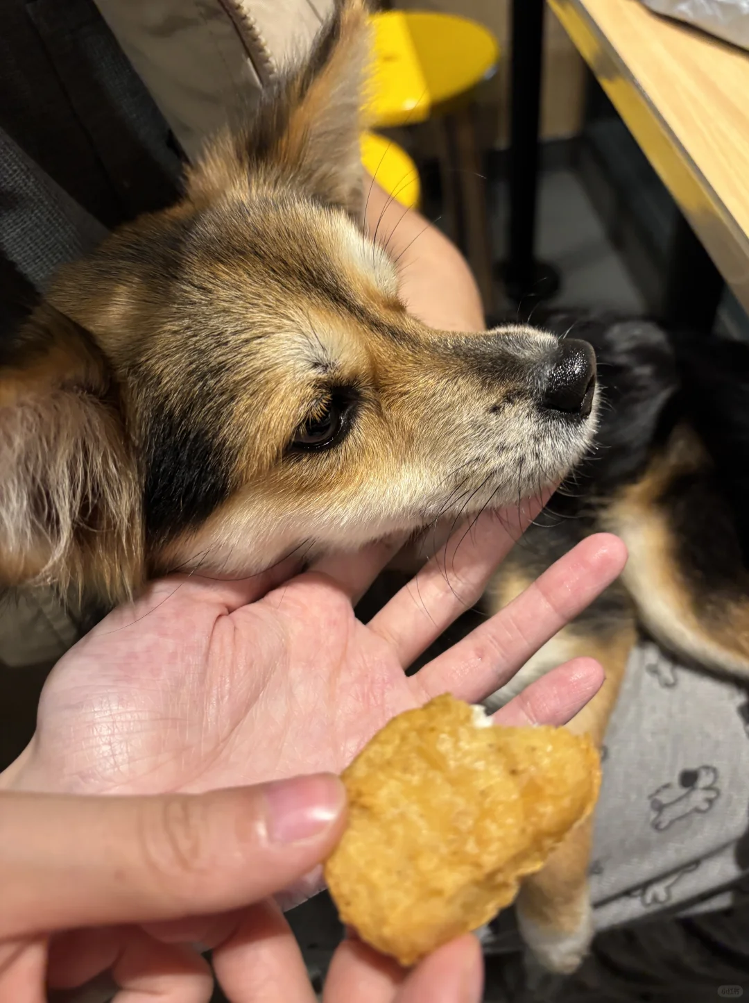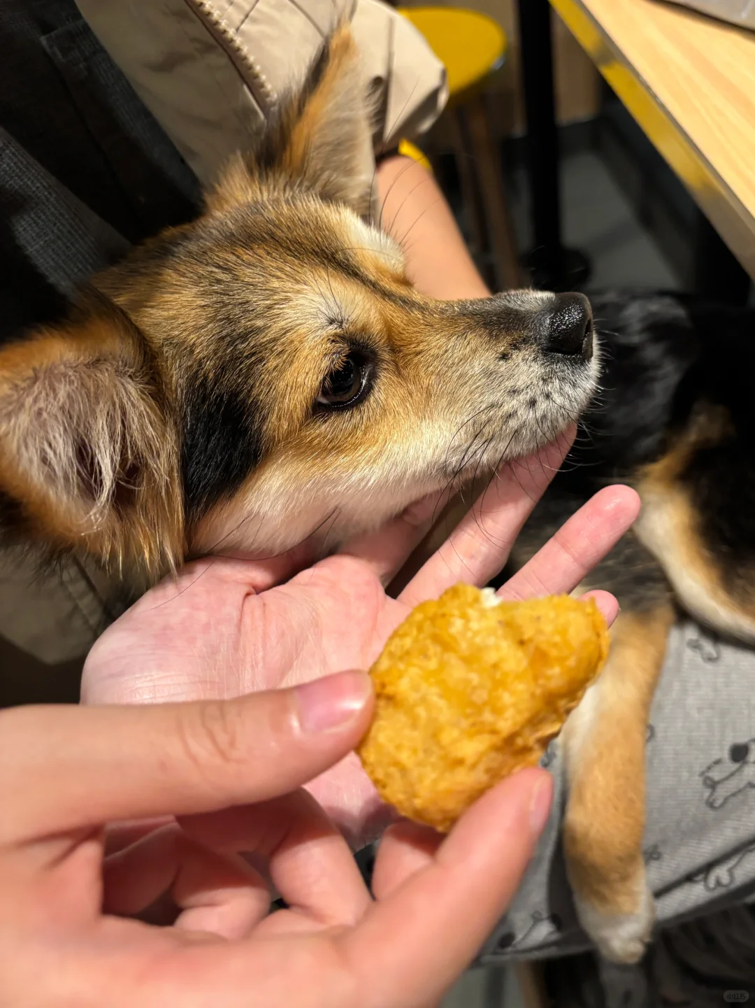 等久了他试图跳到凳子上看我们吃什么,结果失败了一下摔在了地上,饭店的服务员老板娘看到这一幕哈哈大笑。饭店里的一只柯基靠近他一直舔他想和他玩,他只是侧过头,他也没有咬人家。
