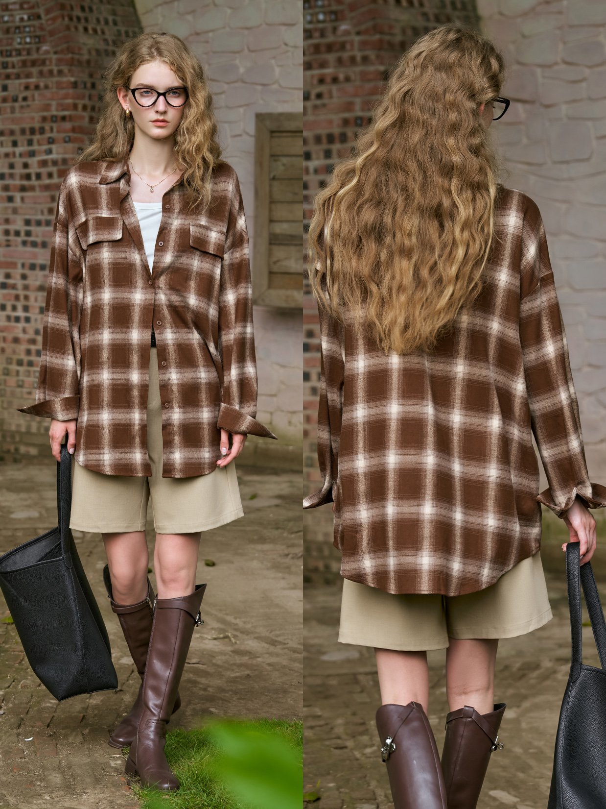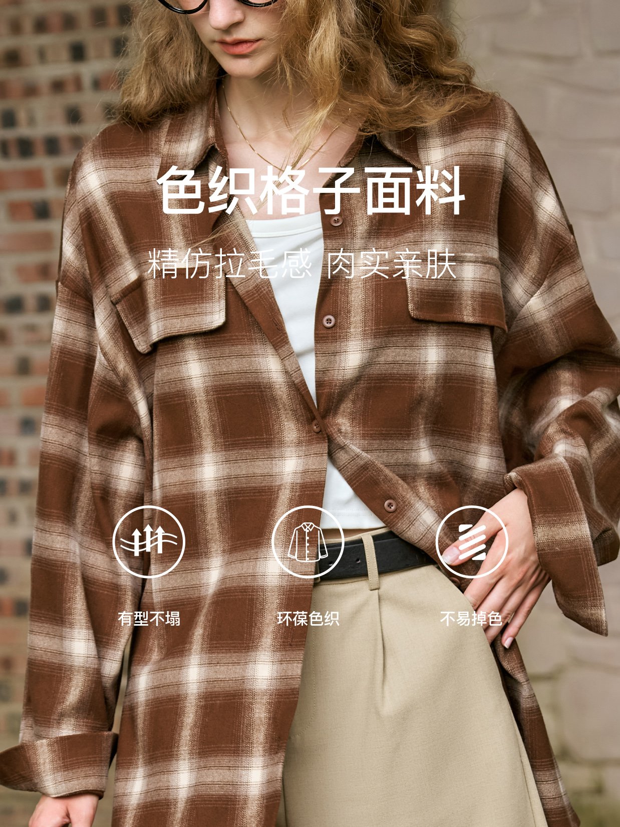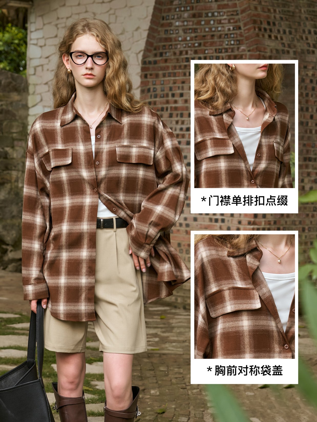 色织格子面料,精仿拉毛感,亲肤不扎;肉实感与廓形感并存,高色牢度不易掉色;复古格子自带秋冬氛围,通勤或休闲絶佳选择;经典衬衫翻领不挑人,胸前双袋盖更帅气;门襟配色单排扣点缀,简洁美观,方便穿脱;落肩设计减龄修饰肩线,显瘦不挑人穿
