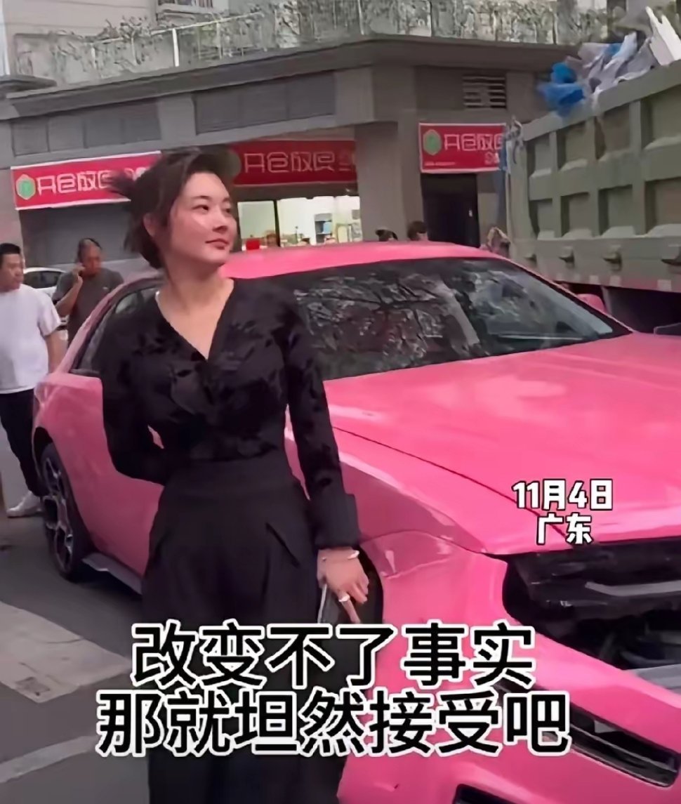 看出来了,这是真正的有钱人,自己的豪车被大货车都撞那样了,美女却面不改色,从容淡