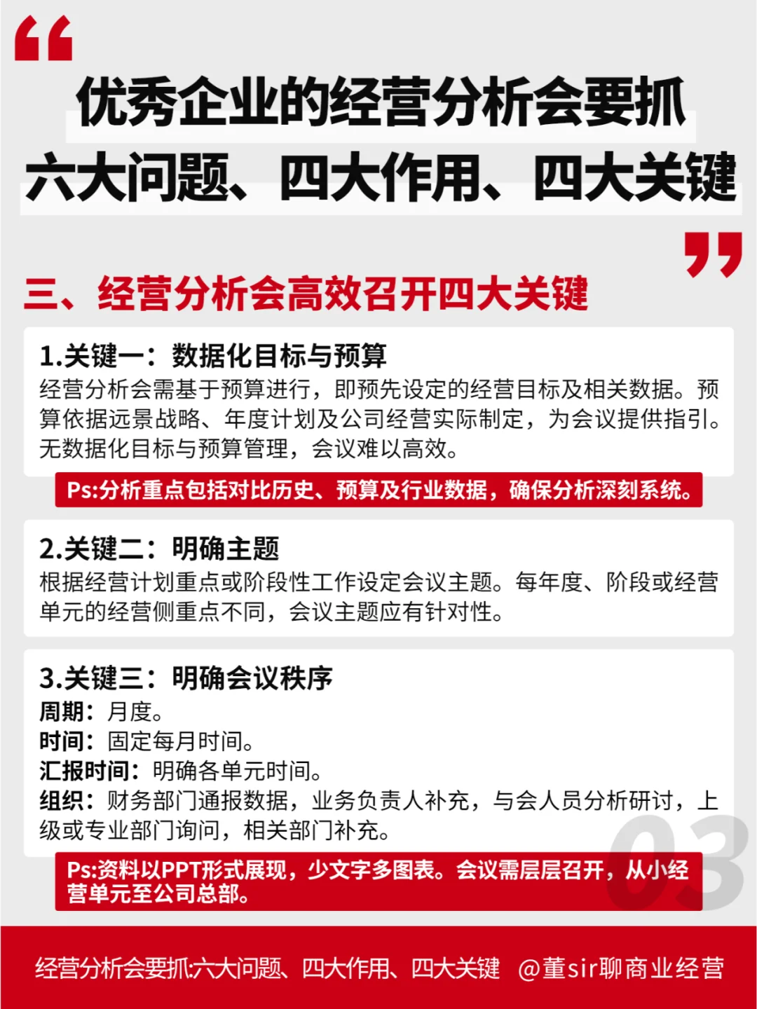 经营分析会是对公司经营成果与现存问题进行总结与剖析的关键会议,通过同比分析、预算对标及标杆对比,切实助力管理团队精准核算“经营账”,明晰现状,进而提升企业的经营效益与管理效率。 经营分析会的重要性不言而喻,想要开好经营分析会,必须要抓:六大问题,四大作用,四大关键。