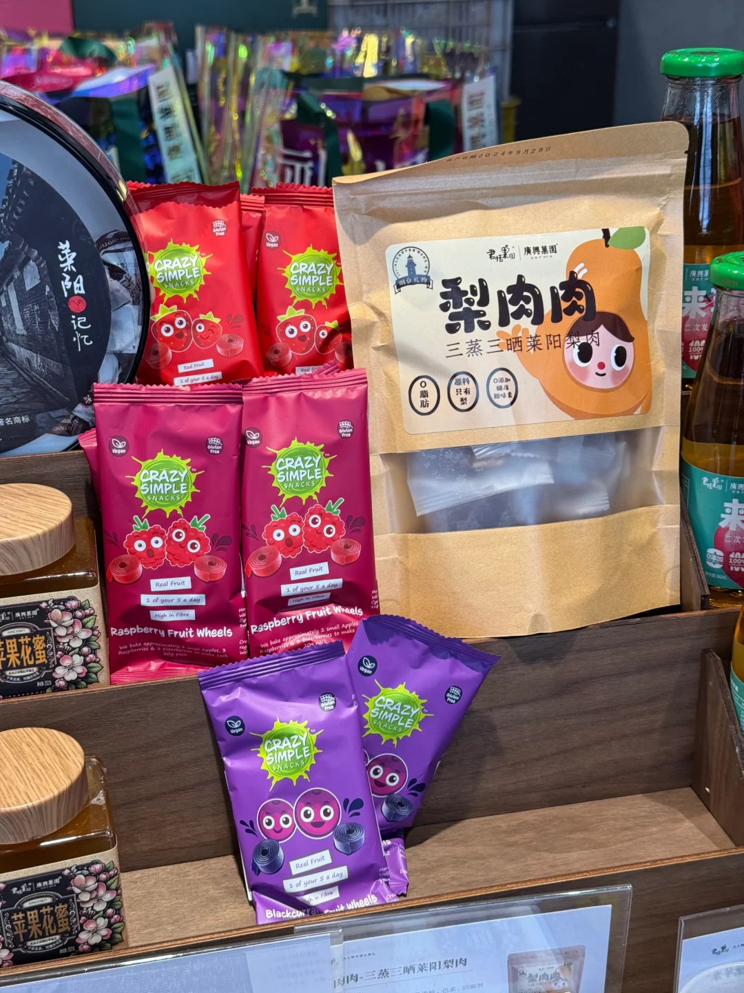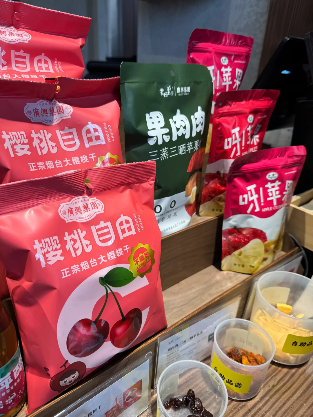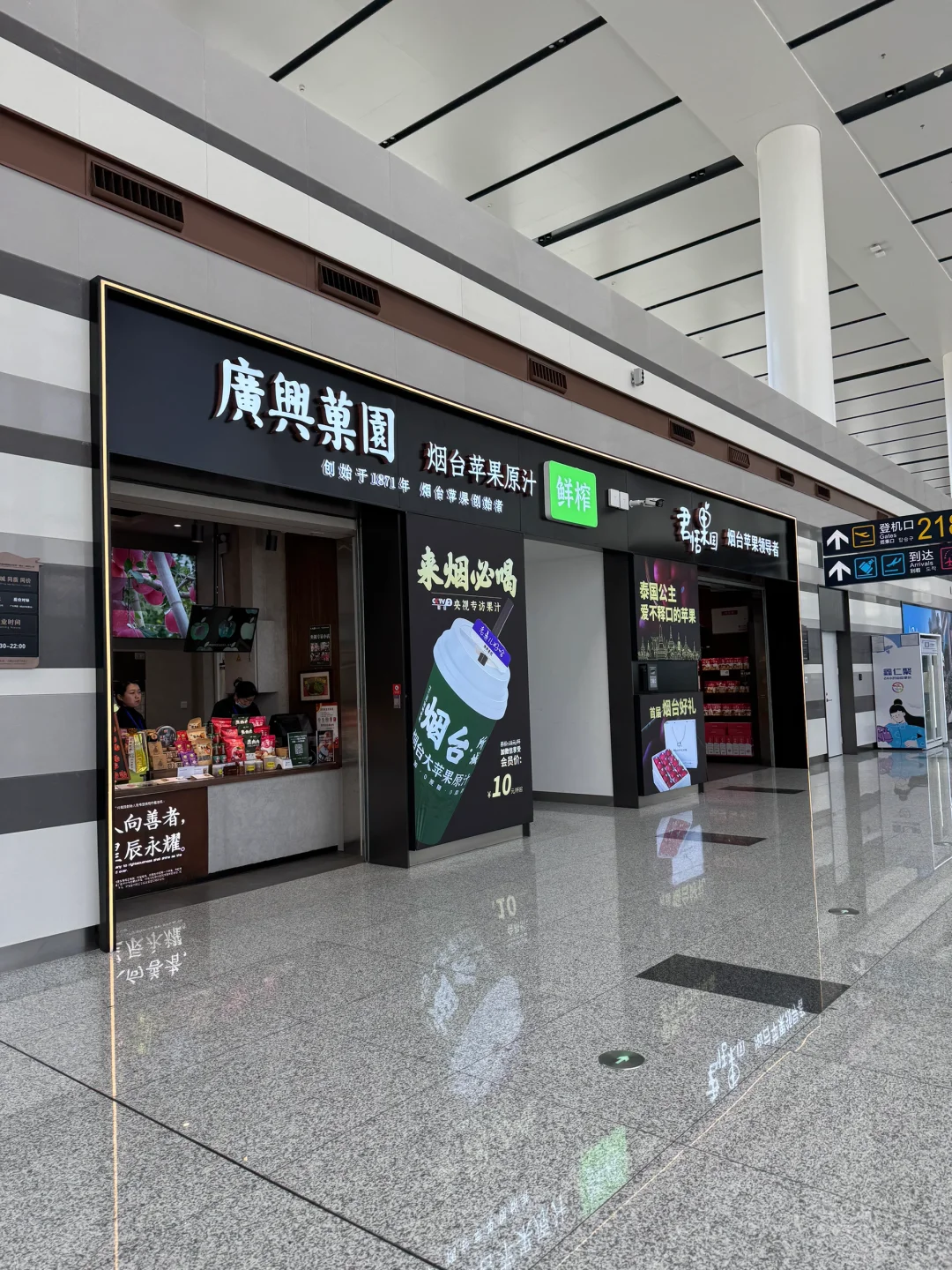在烟台机场路过,鲜榨苹果汁居然才10r一杯,真的好喝!完全没有任何添加,纯纯苹果汁,味道清甜! 喝完一杯没过瘾,又回去看看。尝了果干,苹果干和梨干都好吃,都是不添加糖的,苹果干不到20r,梨干20出头。都是独立包装很方便。樱桃干我觉得有点甜。 还买了点卷卷糖,3个10r。 店名:广兴果园 地址:217登机口附近