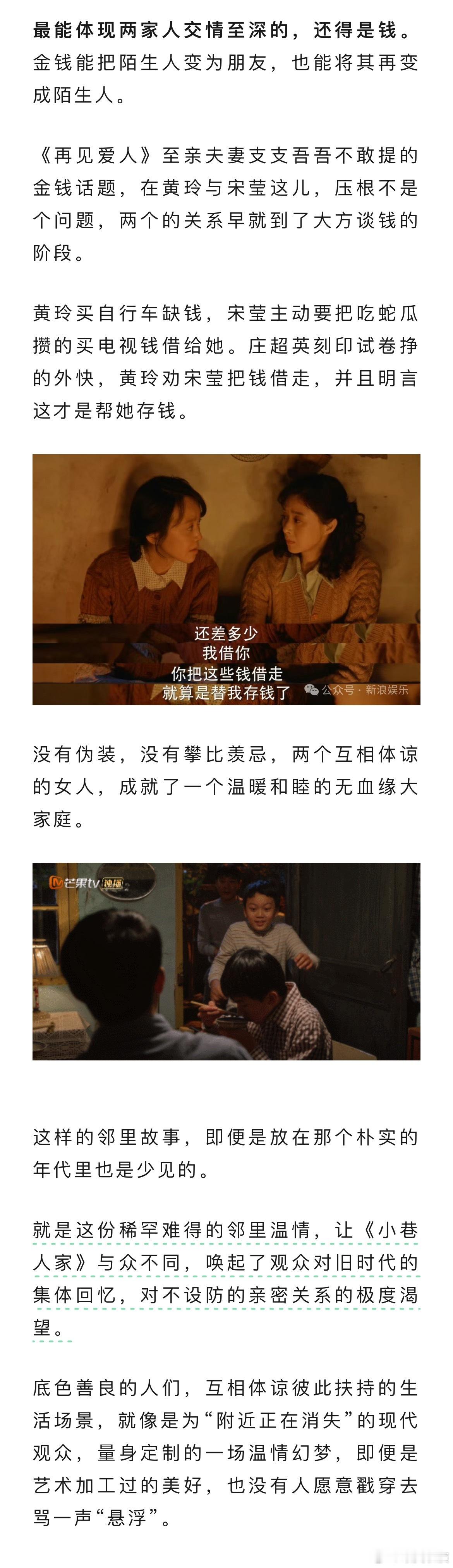 #郭晓东在愚孝男赛道没有对手##黄玲与宋莹 大方谈钱的关系#黄玲与宋莹两家人的邻里故事,即便是放在那个朴实的年代里也是少见的。就是这份稀罕难得的邻里温情,让《小巷人家》与众不同,唤起了观众对旧时代的集体回忆,对不设防的亲密关系的极度渴望。