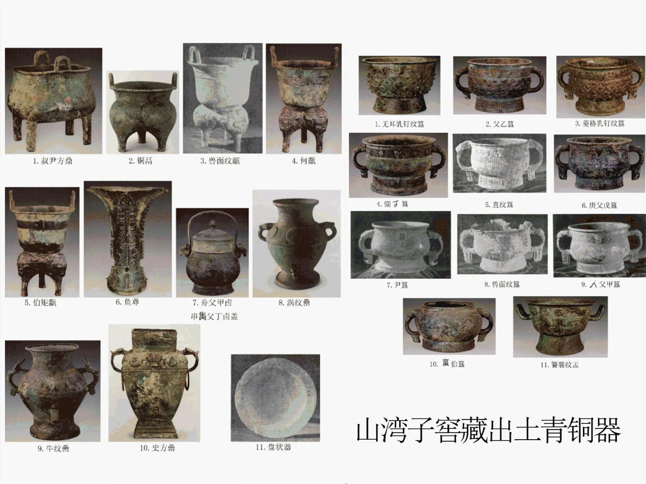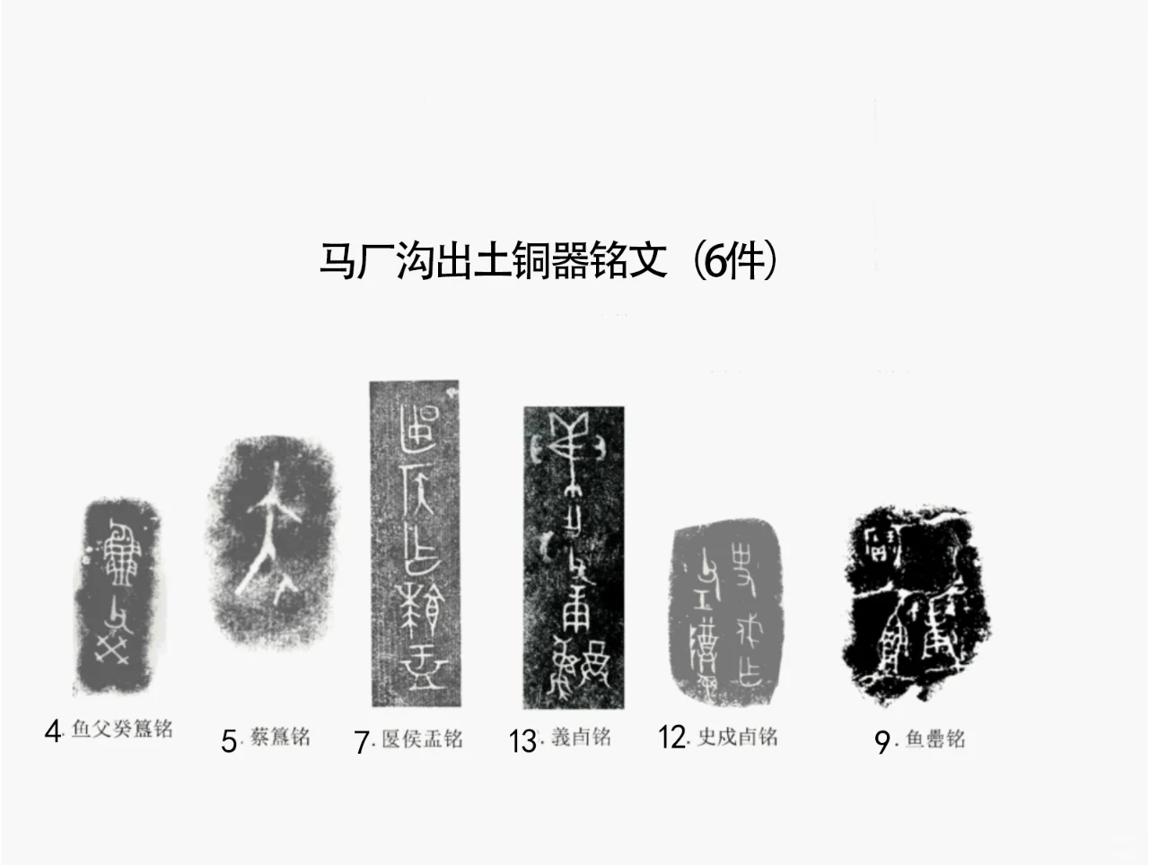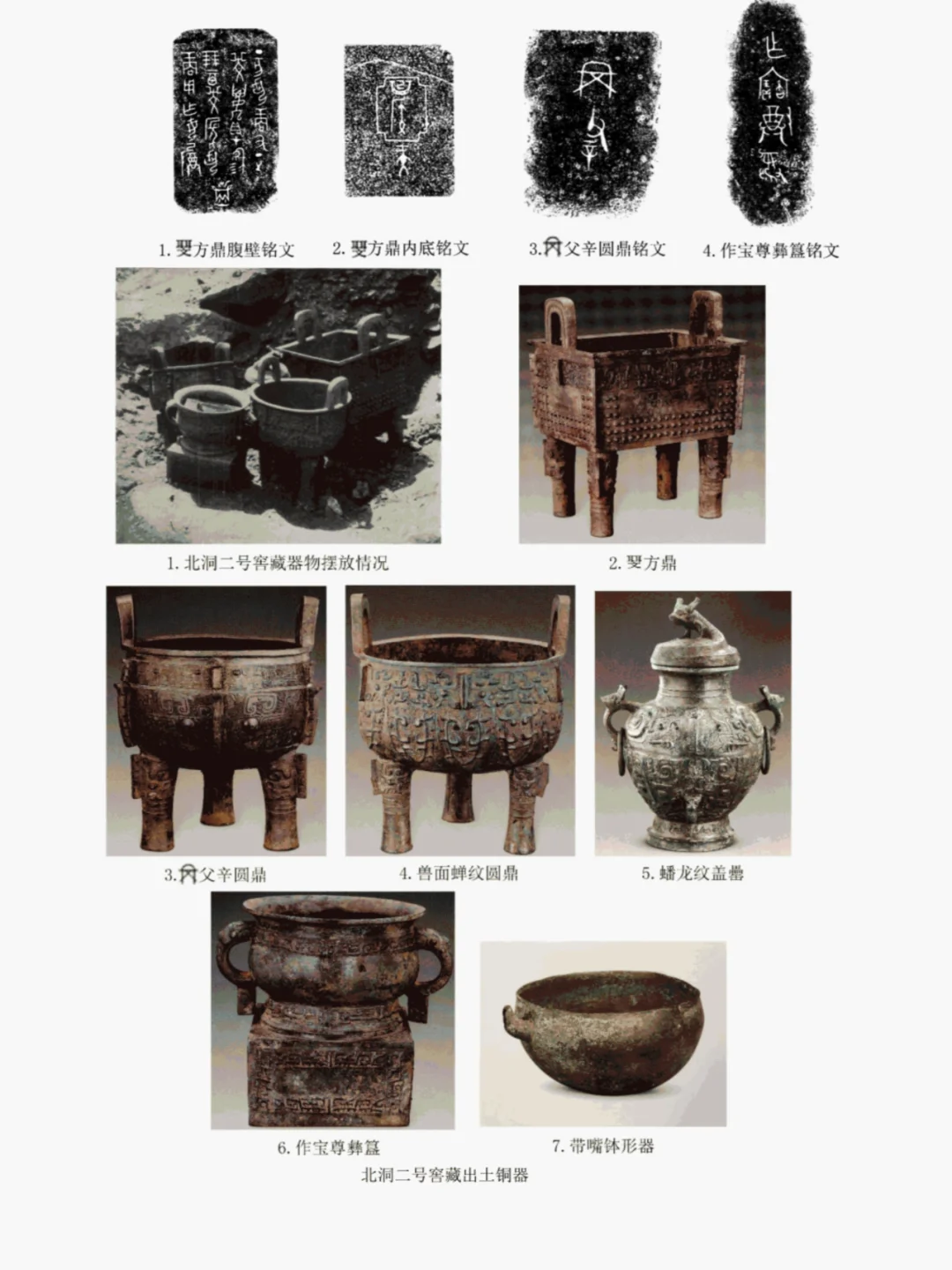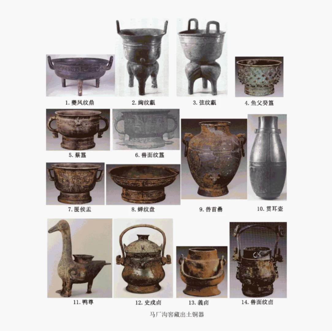 一、喀左地区商末周初青铜器出土地点示意图、出土情况概况(图二)。 自1955年以来在辽宁喀左县先后在马厂沟、北洞、山湾子、小波汰沟四处五批次发现并出土了大量青铜器窖藏,所出青铜器种类有鼎、簋、罍、盂、甗、卣、壶、盘、尊等。大部分器形表现出商末周初铜器的特征。 各窖藏青铜器出土情况介绍: 二、马厂沟窖藏出土青铜器及铭文(图三、四)。 1、窖藏发现情况 1955年5曰12日,当地农民在马厂沟种地时意外耕出。该窖藏未经专业发掘,故简报中对层位关系和器物摆放的记录十分模糊,也没有提供铜器以外的图像信息。可确定的是,当时在铜器附近未出土人骨和葬具,仅有厚达02-3m不等高的灰层和陶片,及石斧、石镰的残片。 2、窖藏出土青铜器数量、种类和铭文。 据发掘简报,窖藏中出土青铜器有16件,计有鼎1、甗2、簋3、盂1、壶1、尊1、罍2(一件被摔碎)、卣2、盘1件,另有2件被掘碎。 三、北洞一号窖藏出土青铜器及铭文(图五)。 1、发现情况 1973年3月6日。辽宁省喀左县北洞村农民在村南孤山西山坡山脚处劳作时发现6件青铜器,经相关单位调查后确认此地为一处窖藏,定名为北洞一号。 据发掘报告,青铜器出土时窖藏坑内填满碎石。 2、 窖藏出土青铜器数量、种类和铭文。 根据发掘报告,共出土6件器物:瓿1、罍5件。出土时器物立置于同一水平面上。 四、 北洞二号窖藏出土青铜器及铭文(图六)。 1、发现情况 1973年5月28日,考古人员在北洞一号窖藏坑东北约3.5米处又发现一处窖藏,命名为北洞二号。 二号窖藏铜器出土时上覆石板,器物与坑壁之间填塞石片,在挖掘坑底时注意保持器物上口平齐,铜器皆立置(图六左上)。 2、 窖藏出土青铜器数量、种类和铭文。 共处铜器6件,方鼎1、圆鼎2、罍1、簋1、带嘴钵形器1件,钵形器出土时置于簋内。 五、山湾子窖藏出土青铜器及铭文(图七、八)。 1、发现情况 1974年12月,喀左县山湾子村农民该窖藏。窖坑内铜器上下叠压,摆放较混乱。 2、 窖藏出土青铜器数量、种类和铭文。 共出土22件铜器,计有鼎1、鬲1、甗3、簋10、盂1、尊1、卣1、罍3、盘状器1、 六、小波汰窖藏及铭文(图九)。 1、发现情况 1978年9月发现,发掘资料至今未刊,仅知其地点在今喀左波汰村。 2、 窖藏出土青铜器数量、种类和铭文。 发掘资料未公布,各家研究中提到的器物互有出入,本文综合各家器物,计有鼎2、簋2、罍2、器盖1、铃首匕1件。