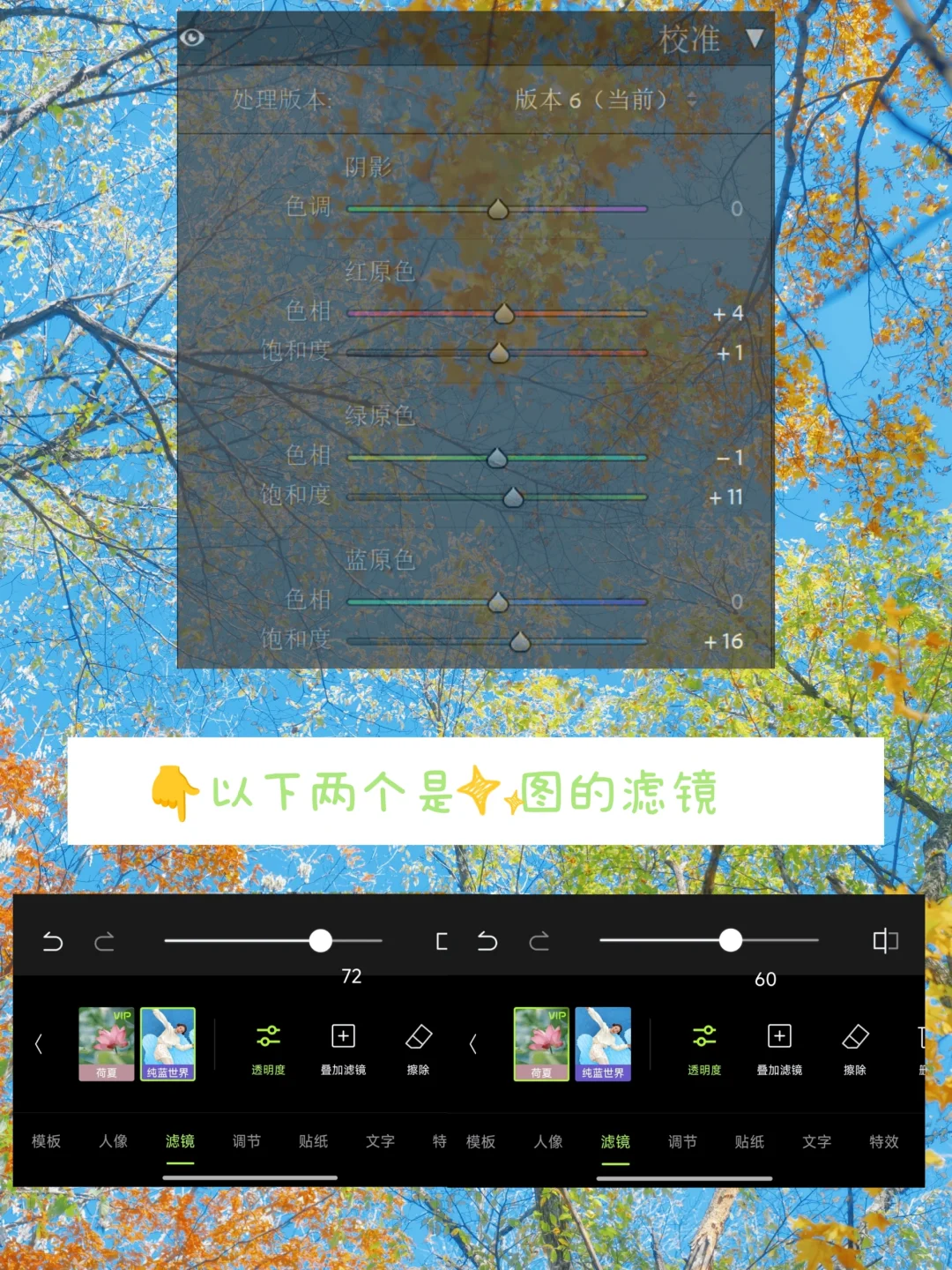 好久没出教程了!!! 因为这组图被很多小伙伴喜欢 所以调色教程就来了!!(快码住) 1⃣️前期拍摄 拍摄时间是中午12-13点左右,晴天🌞 2⃣️调色教程 [Lightroom] 主要见p2-p5 ⚠️tips:这组调色参数很适合晴天,也很适合秋天哦! [⭐图] 主要是加了两个滤镜(大家还是看自己喜欢什么样的效果,根据个人喜好再修改) 👉教程里的参数不是固定公式,大家在调色过程中还需要根据照片本身的情况去调节,希望可以给大家调色提供一些思路❤️
