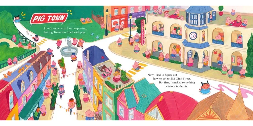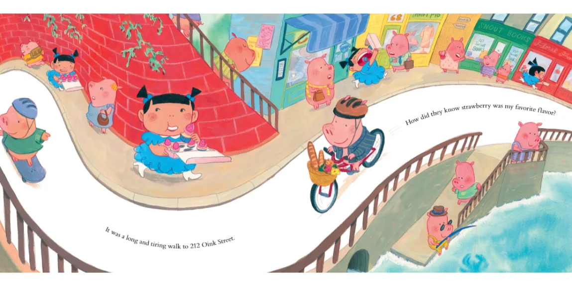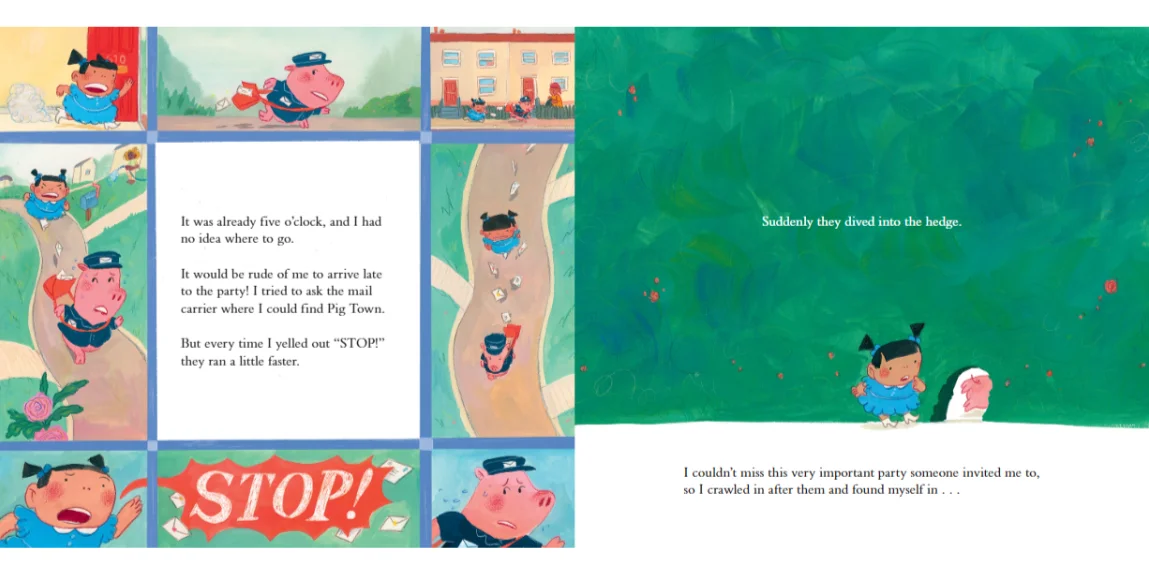 但她觉得很疑惑,而且,“猪猪镇在哪里?”她向一个猪猪邮递员问路,穿过篱笆上的一个洞,最终来到了猪猪小镇。
