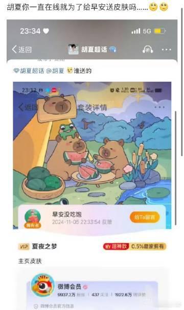 胡夏对卡皮巴拉的热情化为皮肤,送早安是情谊的升华,合照中的兄弟情,似画卷般美丽