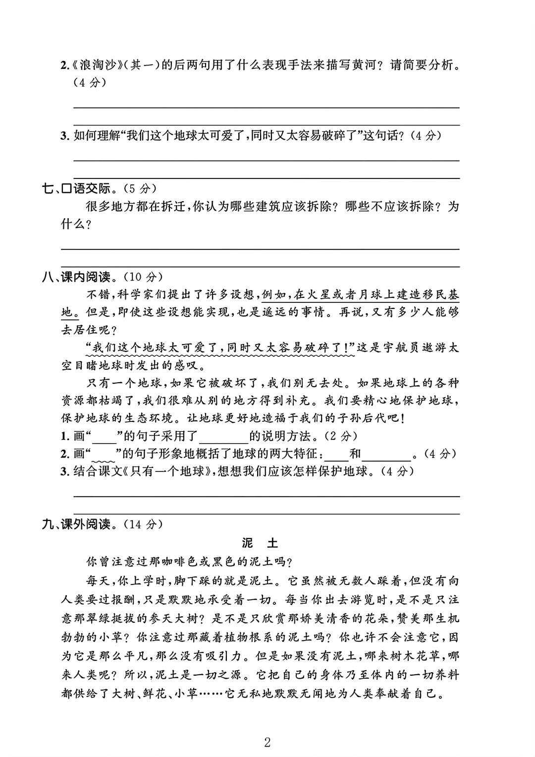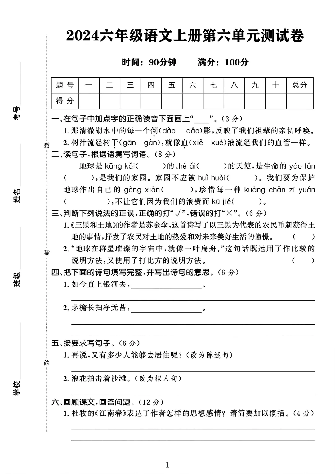 人教版 六年级上册语文 单元测试 第六单元 试卷 电子版可打印