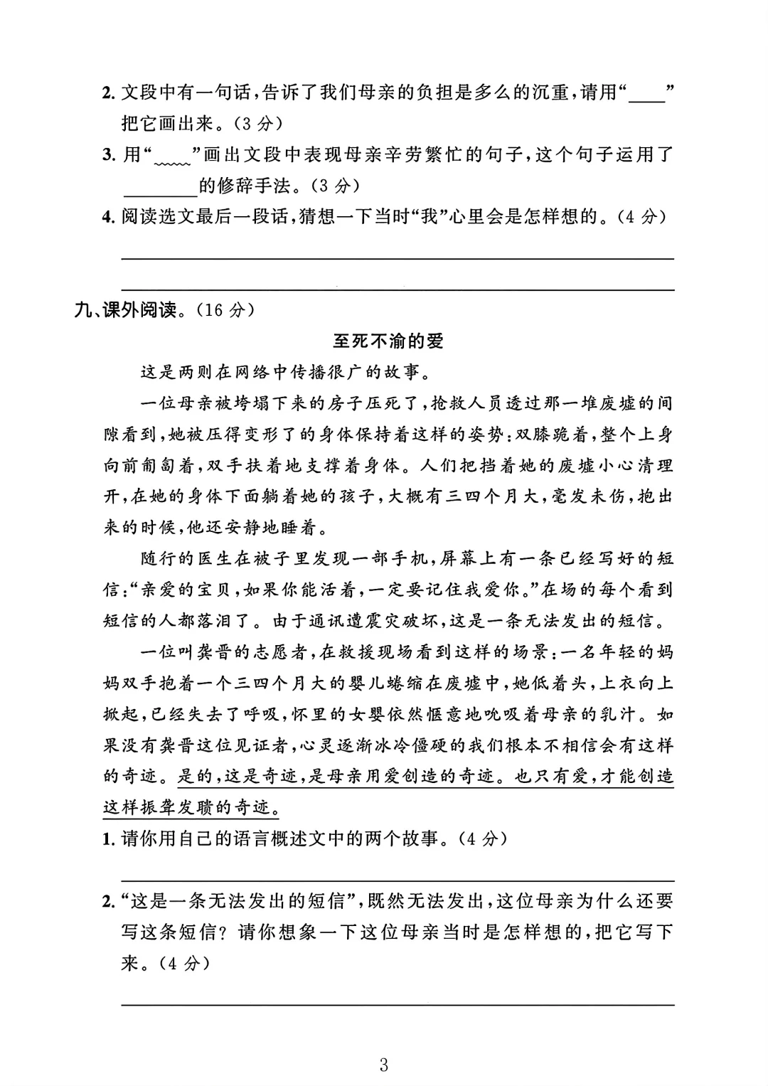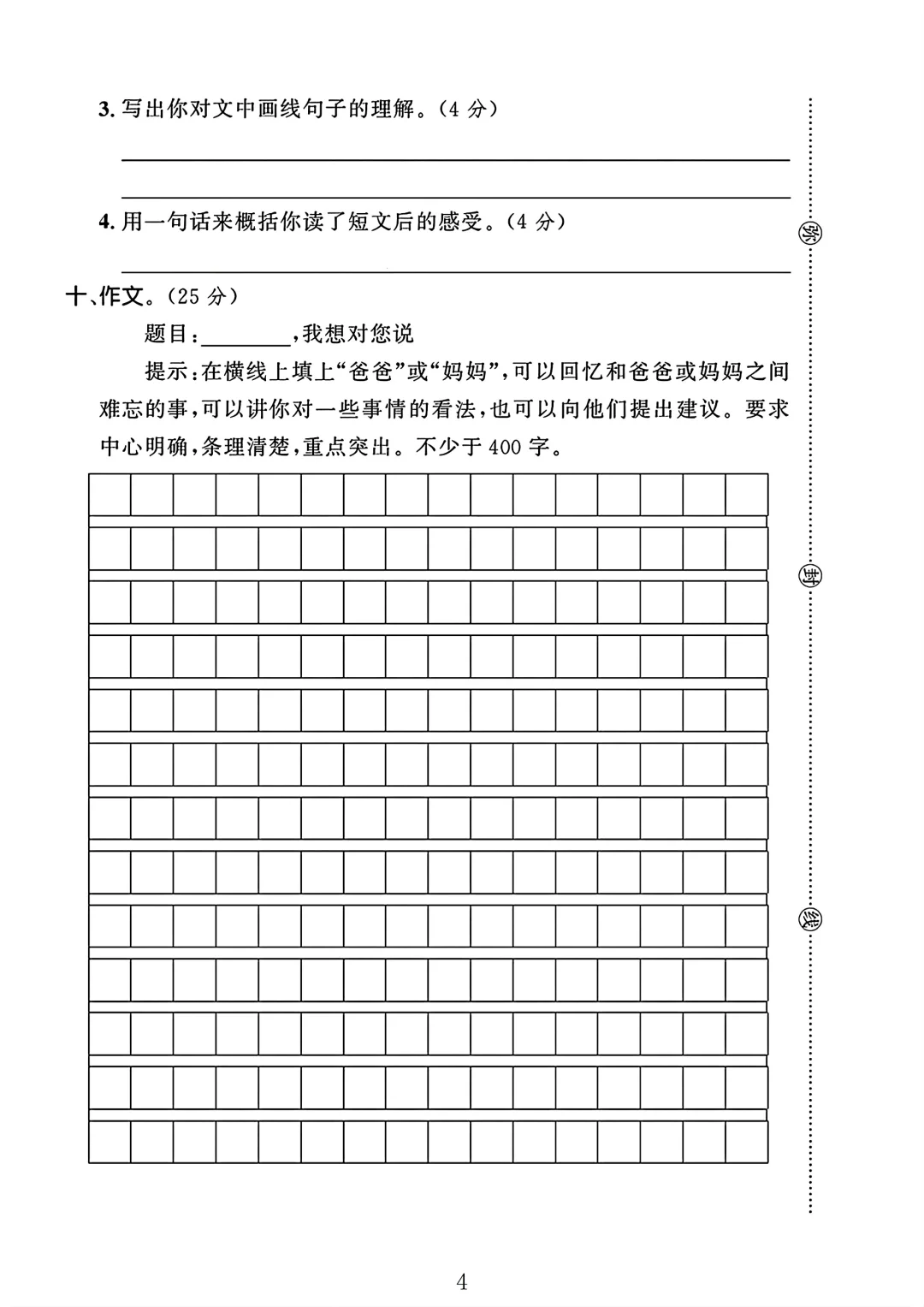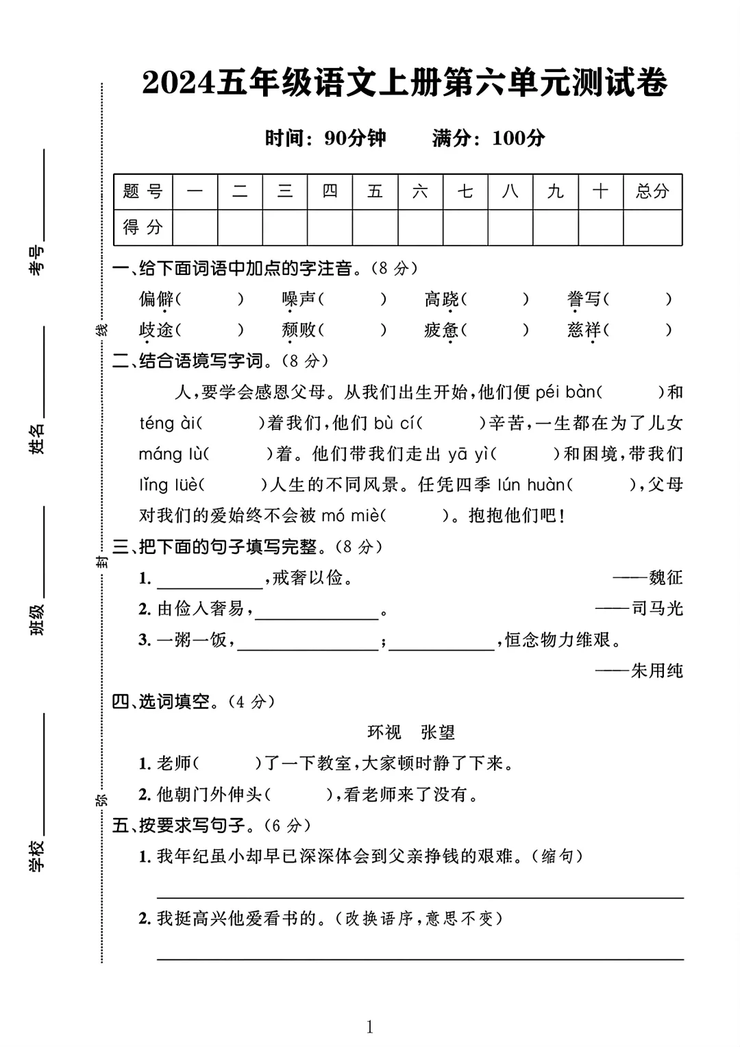 人教版 五年级上册语文 单元测试 第六单元 试卷 电子版可打印