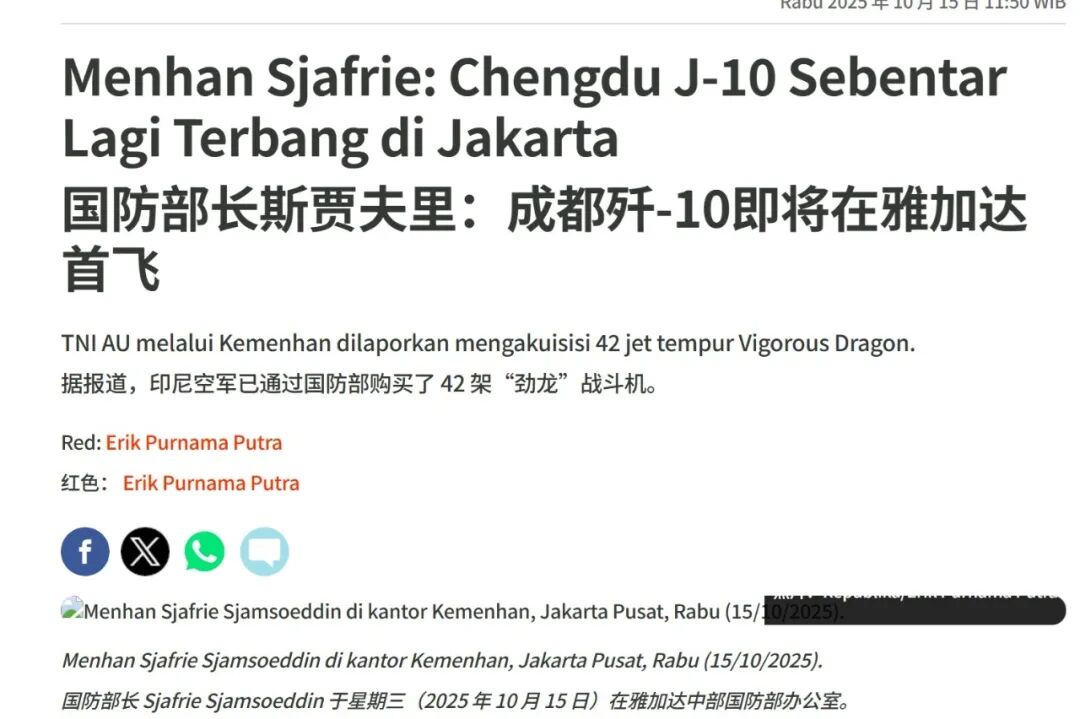 印尼采购装备中国产经历了实战考验的J-10战斗机,堪称是地区防务战略变革的信号,尤其是军机采购的即将落地,印证了两国全面战略伙伴关系的深化。