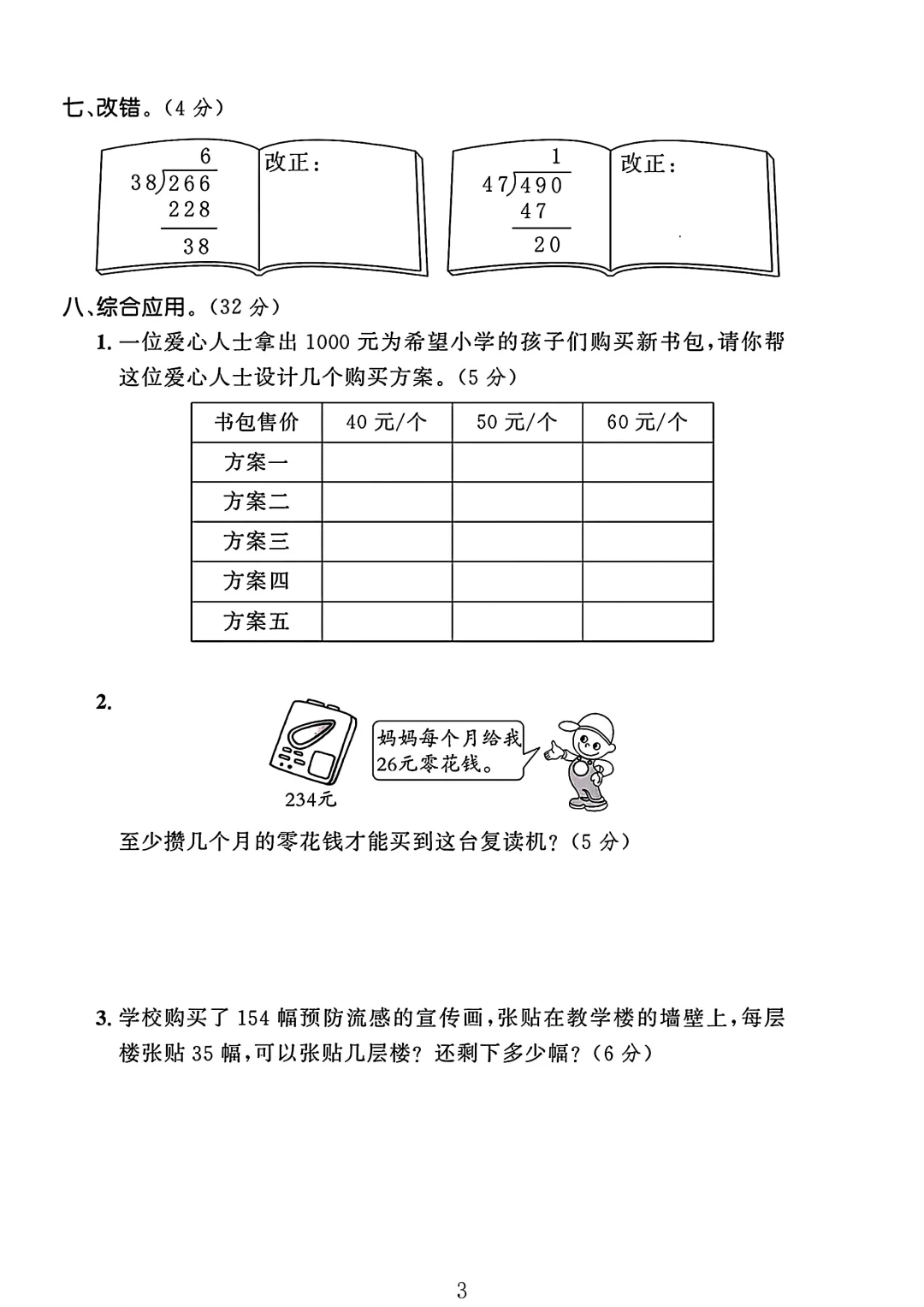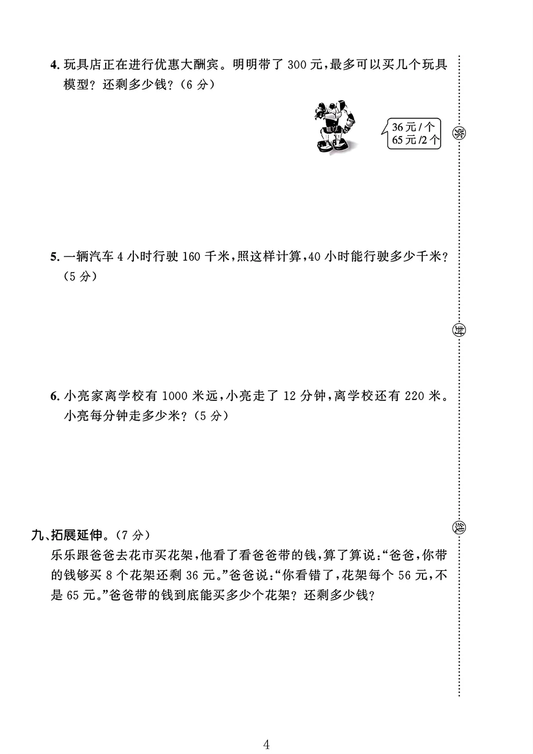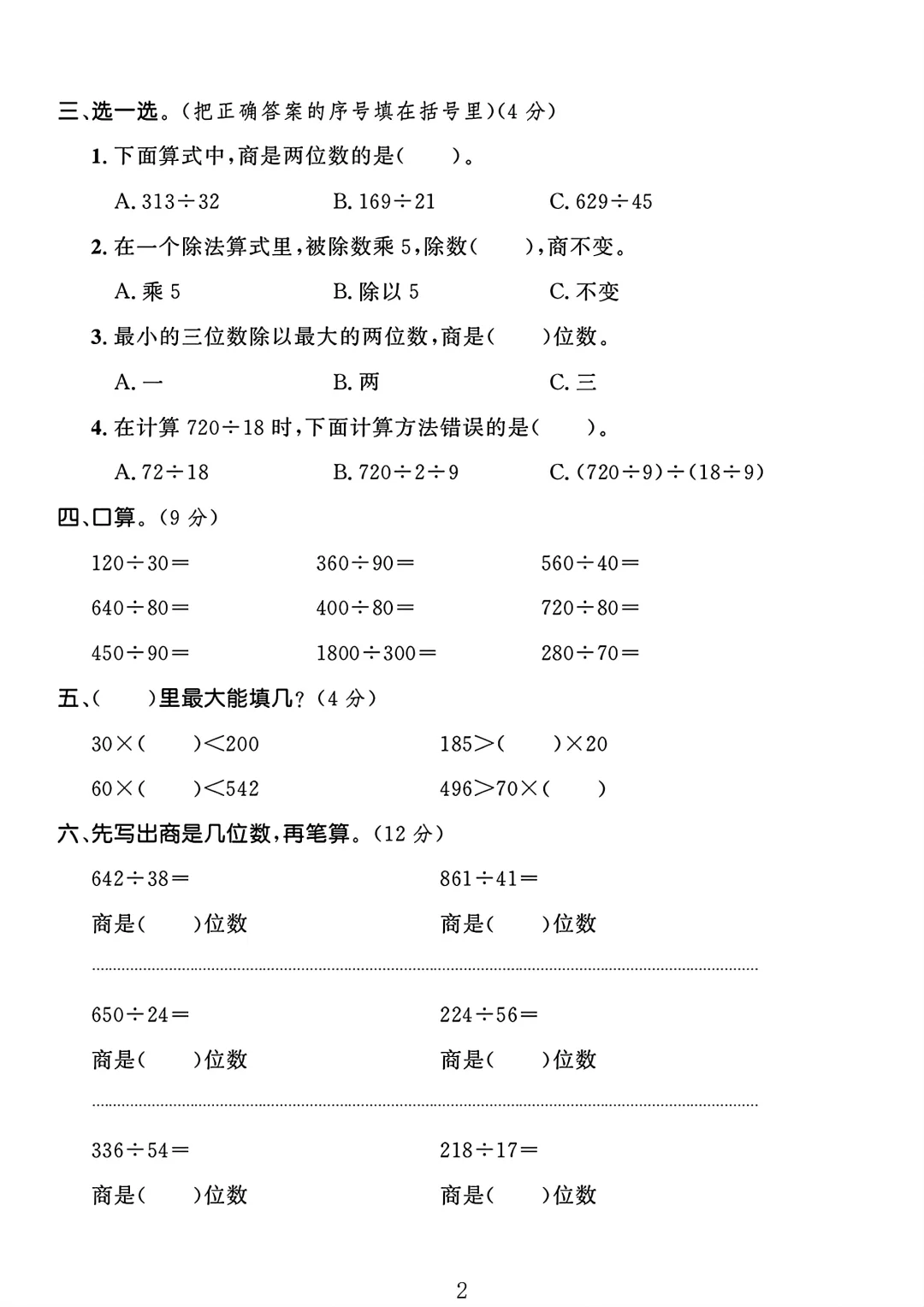 人教版 四年级上册数学 第六单元 试卷 单元测试 电子版可打印