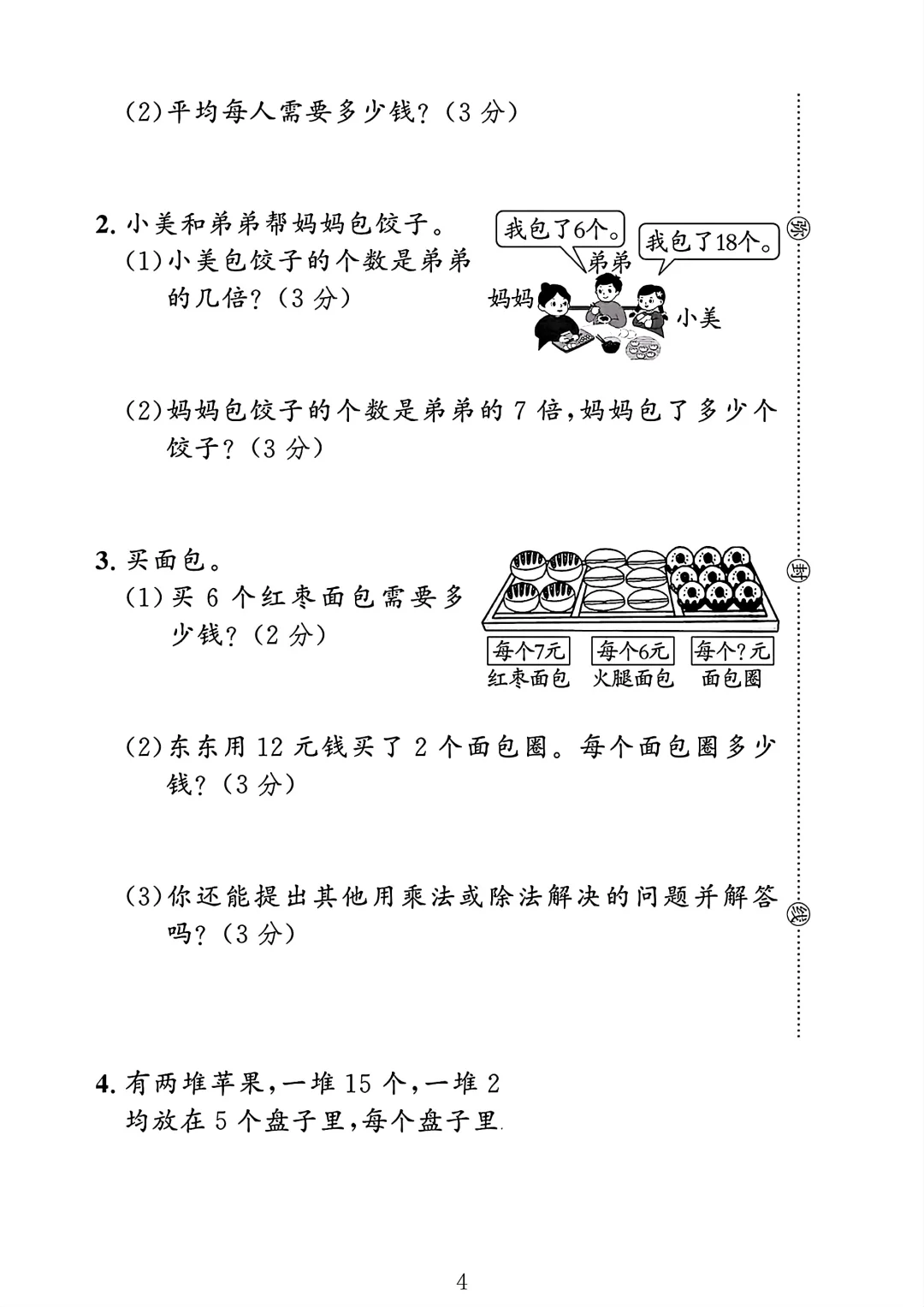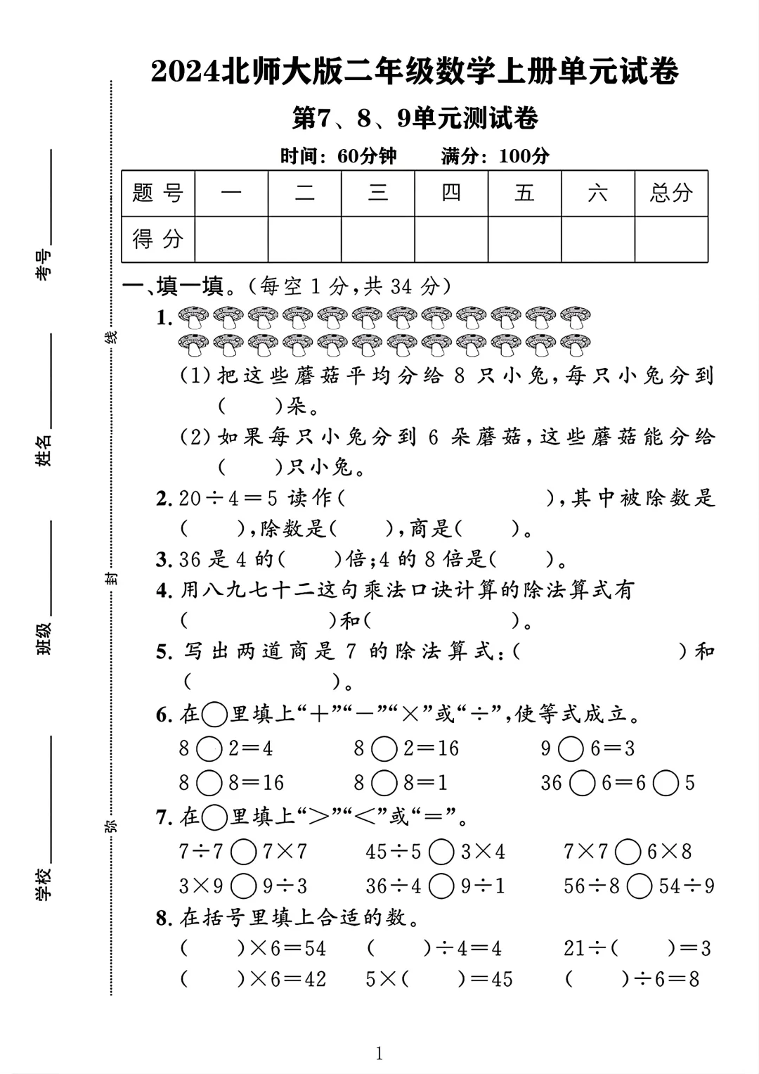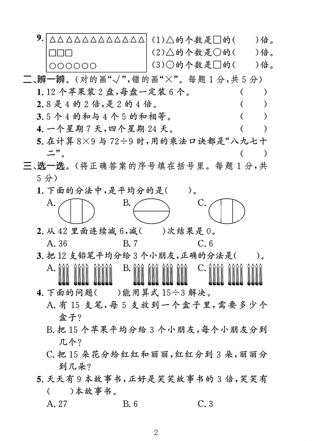 北师大版数学 二年级上册数学 单元测试 试卷 电子版可打印
