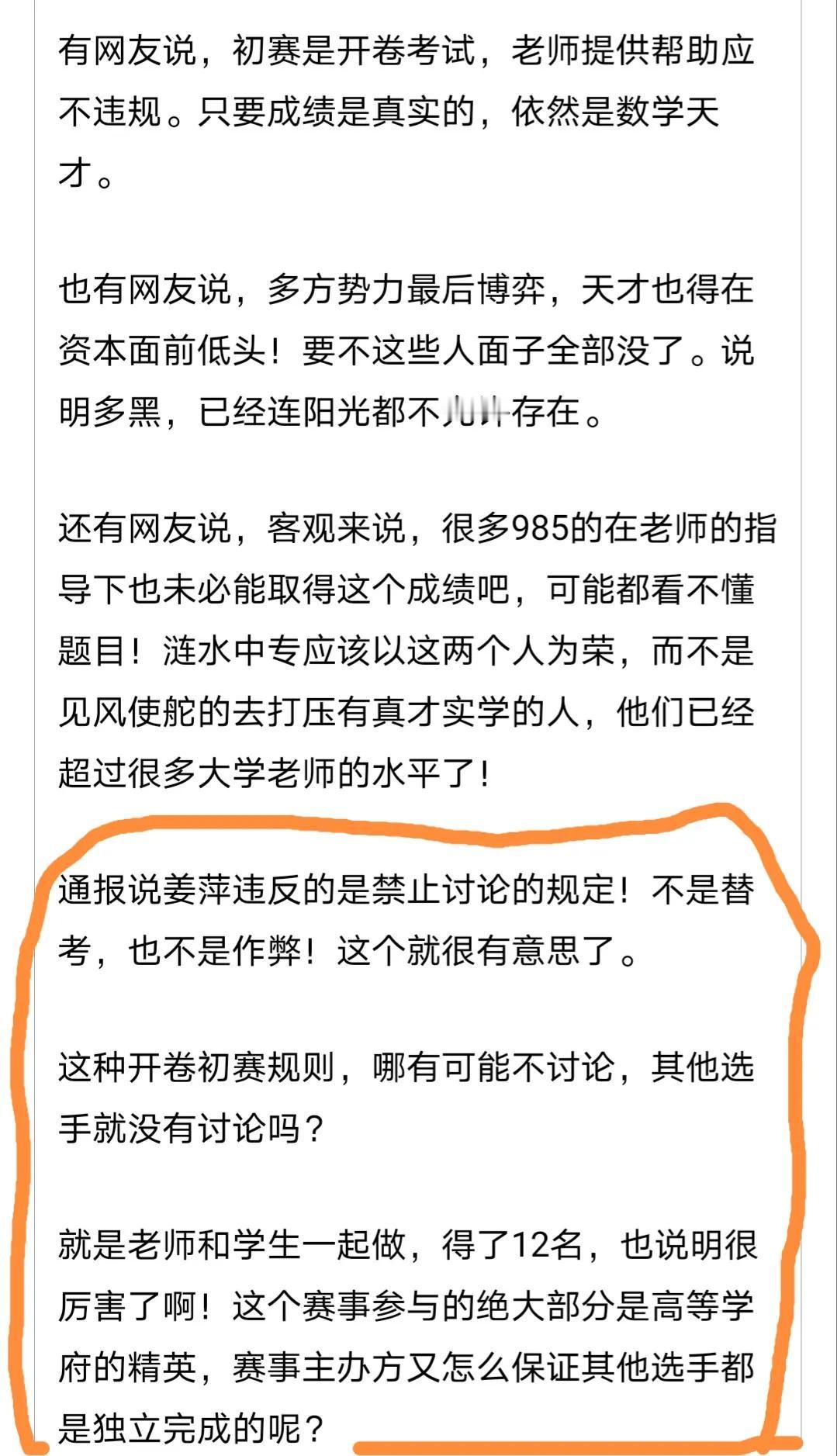 私企资本操控学术赛事活动可以休矣 文/科学真奇妙 近日,阿里巴巴全球数学竞赛组委会发文通报了2024年全球数学竞赛决赛获奖名单,并提及参加决赛的涟水中专教师王某某,学生姜某某决赛成绩未获奖。还特别通报了预赛时江苏省涟水中等专业学校教师王某某为学生提供帮助,违反预选赛“禁止与他人讨论”的规则,并承认比赛规则存在漏洞,暴露出竞赛赛制不够完善,管理不够严谨等问题,对此表示诚挚的歉意等说辞。 作为一个成年人,谁都能猜到阿里巴巴全球数学竞赛组委会通过预赛制造“天才”,制造热点,吸引眼球的门道。阿里巴巴全球数学竞赛组委会一手推出的“17岁天才少女姜萍事件”让人啼笑皆非。当时就有人质疑该事件的真实性,一个入校不到二年的中专生竟然挫败一众世界名校中国名校及数学界大咖?但由于阿里巴巴拍摄的极真实测视频宣传和凤凰卫视播报等为其站台撑腰,结果一个寒门子女入校不到二年的普通中专女生励志的故事就被冲上了热搜,坐拥全球预赛12名头衔,身后是一众哈佛,剑桥,清华,北大数理科生及中科院专家教授。该事件还曾一度引发《人民日报》,央视新闻客户端等中央媒体的转发或高度关注。人们那时就非常纳闷,一个私人企业的预赛成绩排名,不集中统一监控测试,赛制又如此松散,又不是决赛成绩排名,何必要大张旗鼓的宣传呢?甚至还有人不断鼓吹姜同学凭此成绩即可直接晋升清华,北京大学,浙江大学等校园。该事件还连带地对中国逢进必考的人才录用制度,基础学课设计制度,大学人才录取机制,中国教育制度改革,官派机构国立大学学术权威等进行了嘲笑贬低,狂轰滥炸乃至猛烈抨击! 现在阿里巴巴全球数学竞赛组委会竟然用一句轻飘飘的“承认比赛规则存在漏洞,暴露出竞赛赛制不够完善,管理不够严谨等问题,对此表示诚挚的歉意”等说辞来个一推了之。在赚足了流量,博得了众人眼球之后,阿里巴巴全球数学竞赛组委会竟然把这个事件的黑锅让江苏省涟水中等专业学校教师王某某和学生姜某身上。人们不仅要质问既然阿里巴巴全球数学竞赛预赛涟水中专生姜某全球12名的成绩明显出人意料,阿里巴巴是怎么去核实查证的?是谁有这么大能量把姜萍事件炒热到天下尽知?是谁继续在八月份还在炒作姜萍独立完成决赛,微笑走出考场,寒门女生已赢,决赛78分?我想国家启用天眼系统一查便知! 中国这么多年弄出一个私企涉足学术赛事,自导自演弄出个惊天动地,地球人都知道的乌龙事件,真的让全世界数学届,学术界贻笑大方啊!此后,中国的数学家,科学家,学术界领头人再走出国门参加各种学术会议,外国人不仅要一脸坏笑地当面问询“你们那个阿里巴巴全球数学竞赛预赛12名姜students,是怎么一回事啊?”姜同学这个事件的真伪识别没有一点技术含量,即便是派一个村干部去核查都能把这事弄的一清二楚,然而本硕士研究生成堆的阿里巴巴却把它弄成了一个全球笑柄。 对此,我有个小小建议, 私企资本操控学术赛事活动可以休矣!一是阿里巴巴是一个民营企业,这个阿里巴巴全球数学竞赛组委会没有对全球数学能力评价的资质,让资本操作去评论大学排名,操控官派机构(中科院)权威,除了大逆不道外,更为严重的是容易陷入被资本操作的怪圈!二是江苏省涟水中等专业学校为公办学校,不应接受私企阿里巴巴全球数学竞赛组委会处理意见。哪有一所公办学校向一个民营企业低头的事情?它不是你的所属上级,没有按照它的意思做事的义务。三是教师王润秋和学生姜萍应该状告阿里巴巴全球数学竞赛组委会黑幕操作,在阿里巴巴吸足了世界眼球和关注后,一推了之。法律上还有一个原则:法无禁止皆可为。阿里巴巴全球数学竞赛组委会预赛规则存在严重的漏洞,不可由王,姜二人背欺世之锅!这个黑锅及追责问责必须由阿里巴巴集团承担!