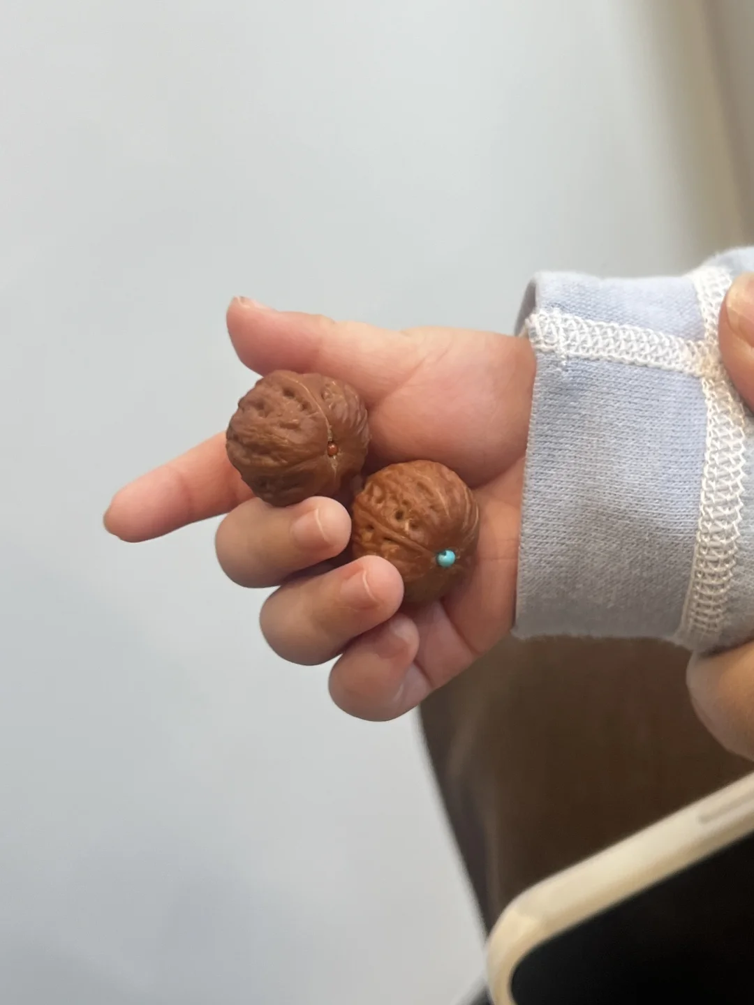 右划看“核桃”真正的大小 盘串从娃娃抓起 还给镶了一对南红绿松 可爱至极
