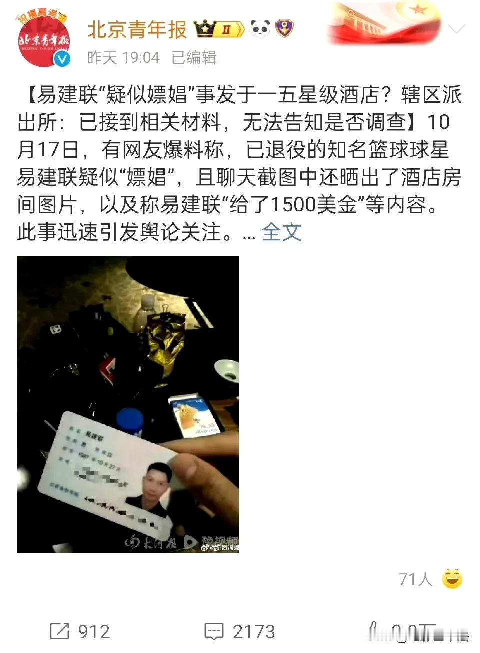 11月8日,曝光易建联PC的京城乔姐,疑似已入狱! 根据多位博主爆料,易建联绯闻对象,变性人京城乔姐,疑似已经入狱,入狱原因与其爆料易建联有关,根据专业人士推测,京城乔姐至少要判6年,最高可达10年。 京城乔姐是著名网红,今年才19岁,最早因男扮女装走红网络,经常乘坐迈巴赫s480出门,曾经因为擅自闯入女浴室更衣还拍照上传网络而引起巨大争议被行政拘留,还曾因为模仿黄晓明妻子叶珂而引起轰动,目前京城乔姐的账号已被封禁,网传他在被抓之前曾经用小号爆料,易建联的事不是他曝光的,而是其他人盗用他头像冒充他曝光的。 网友们看后纷纷评论: 一个被窝睡不出两种人,不应该一起惩罚吗? 到现在蓝底公告都没出,看来确有其事。 那易千五呢?卖的进去了,嫖客呢? 哦,那他到底关男监还是女监呢? 如果真的坐牢,易建联等于间接承认了。 嫖完就给人整进去啊。 乔姐都进去多少次了? 所以那些照片,记录是真的? 这种畸形毒瘤怎么还存在于社会上!再有再抓! 这不造谣吗?都没审判怎么入狱? …… 目前易建联方面暂时没有对此发声,同情他支持他和认为他应该也进去的网友同样都很多,而京城乔姐到底有没有被抓,如果被抓是什么原因,一切还是未知数,我们还是静待公告吧,相信法律会对此事作出公正的判决!