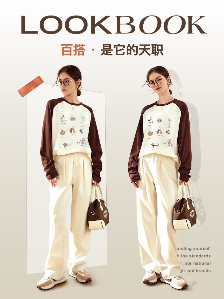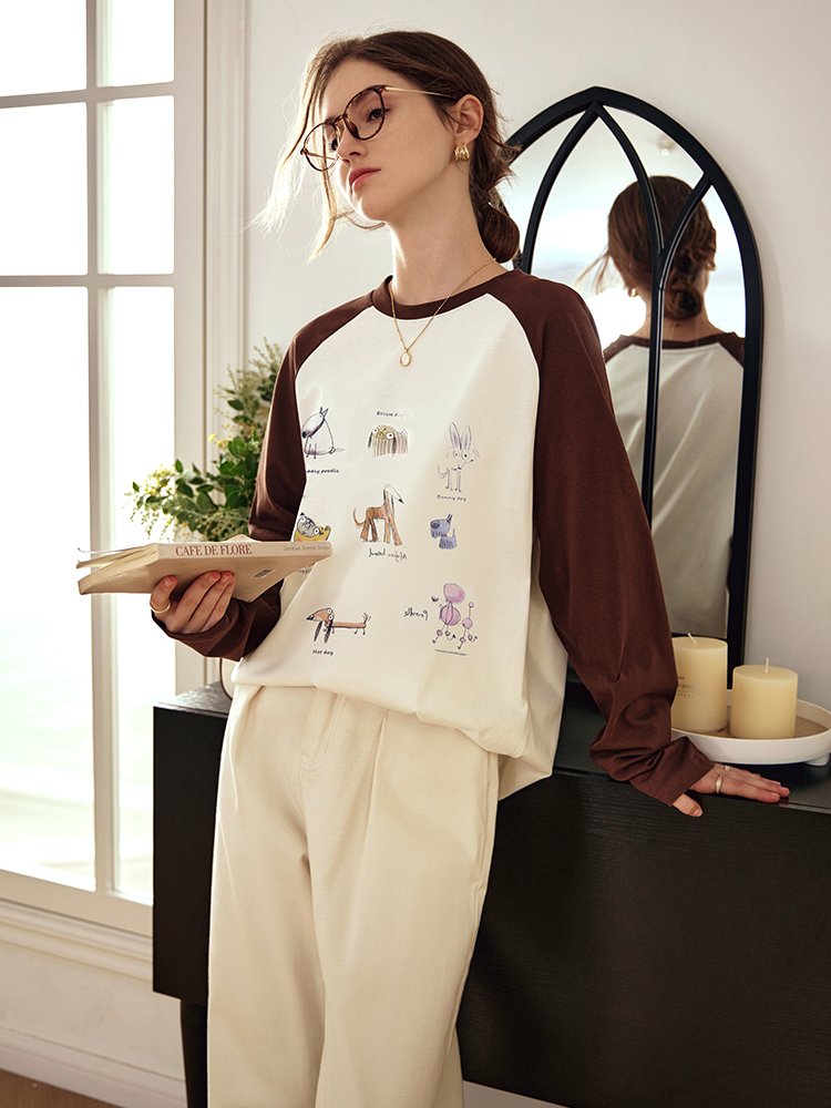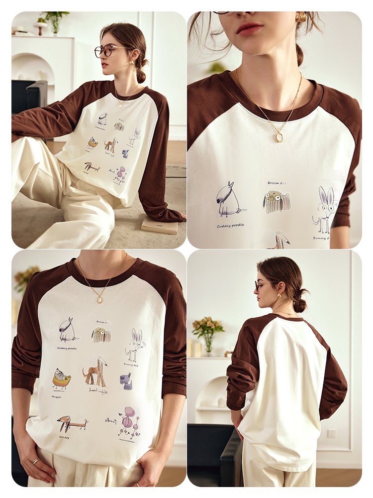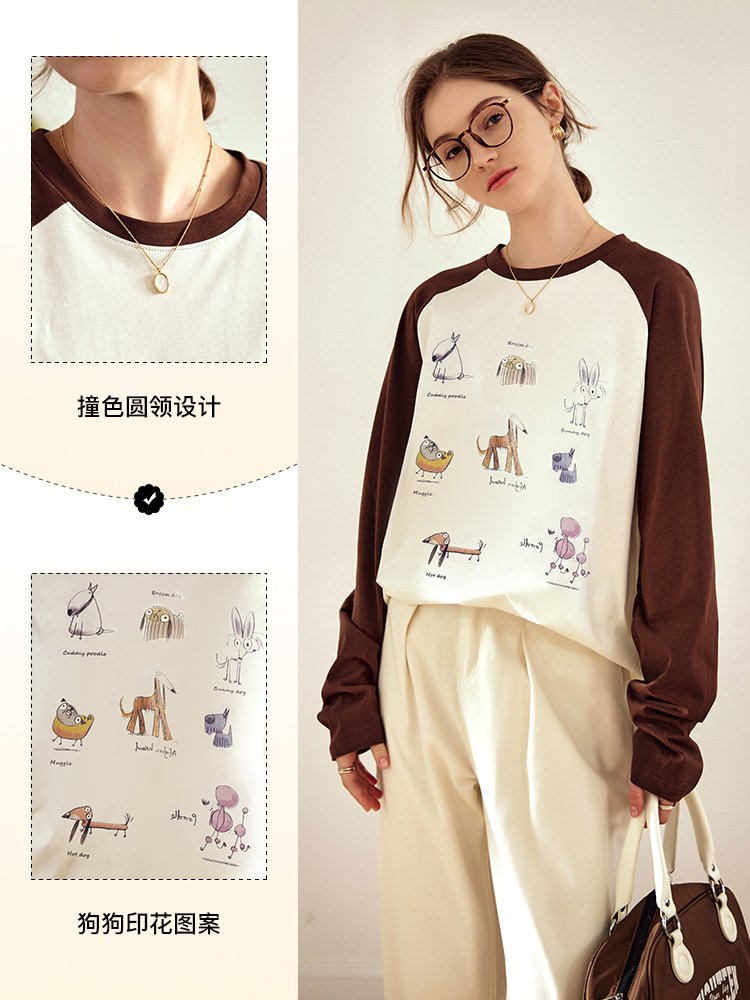 甄选棉针织面料,亲肤篙弹无束缚,包容性好;高织高密,不易变形起毛球,日常好打理;撞色圆领+插肩袖,颜色复古又篙级,时髦显瘦;前中狗狗印花,字母点缀,减龄又不幼龄