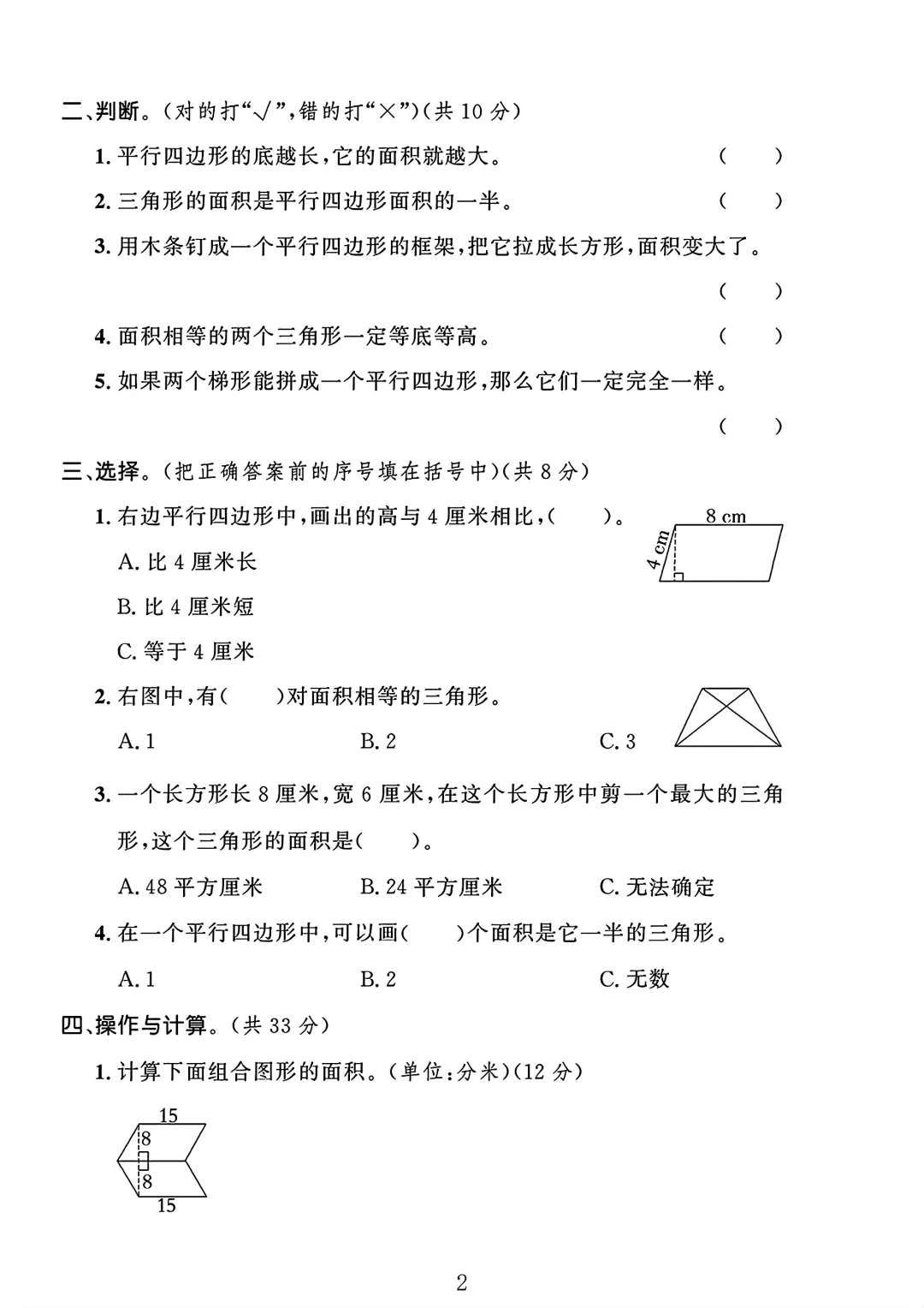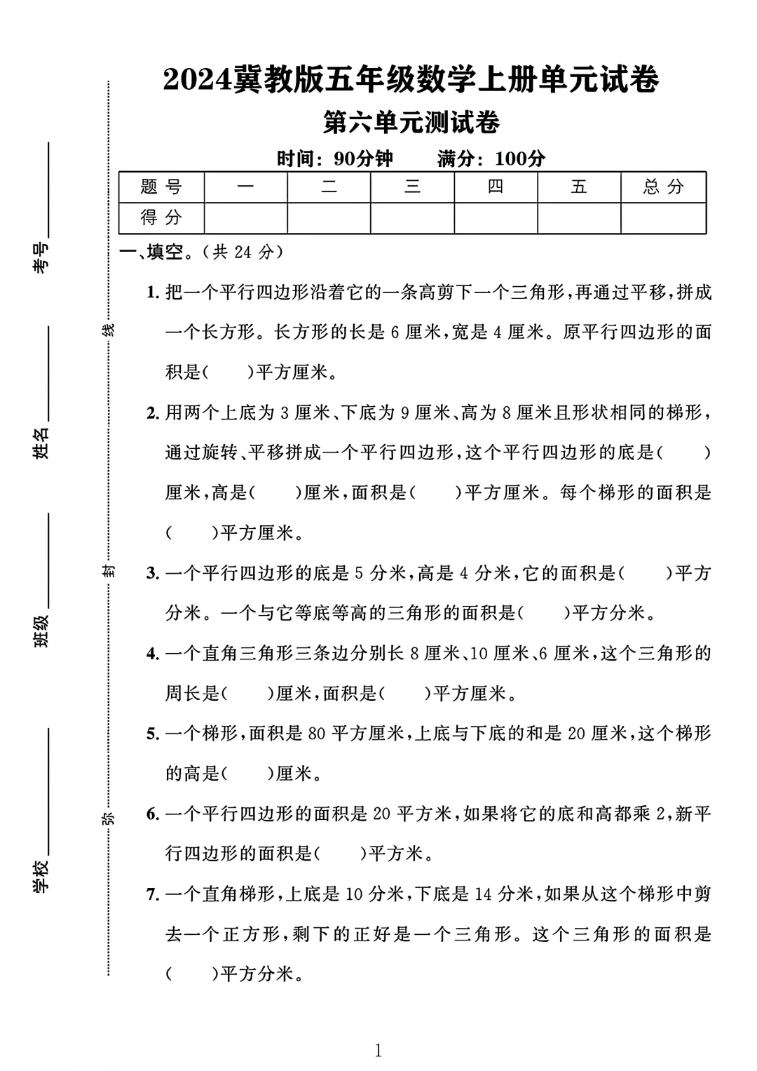 冀教版 五年级上册数学 第六单元 试卷 单元测试 电子版可打印