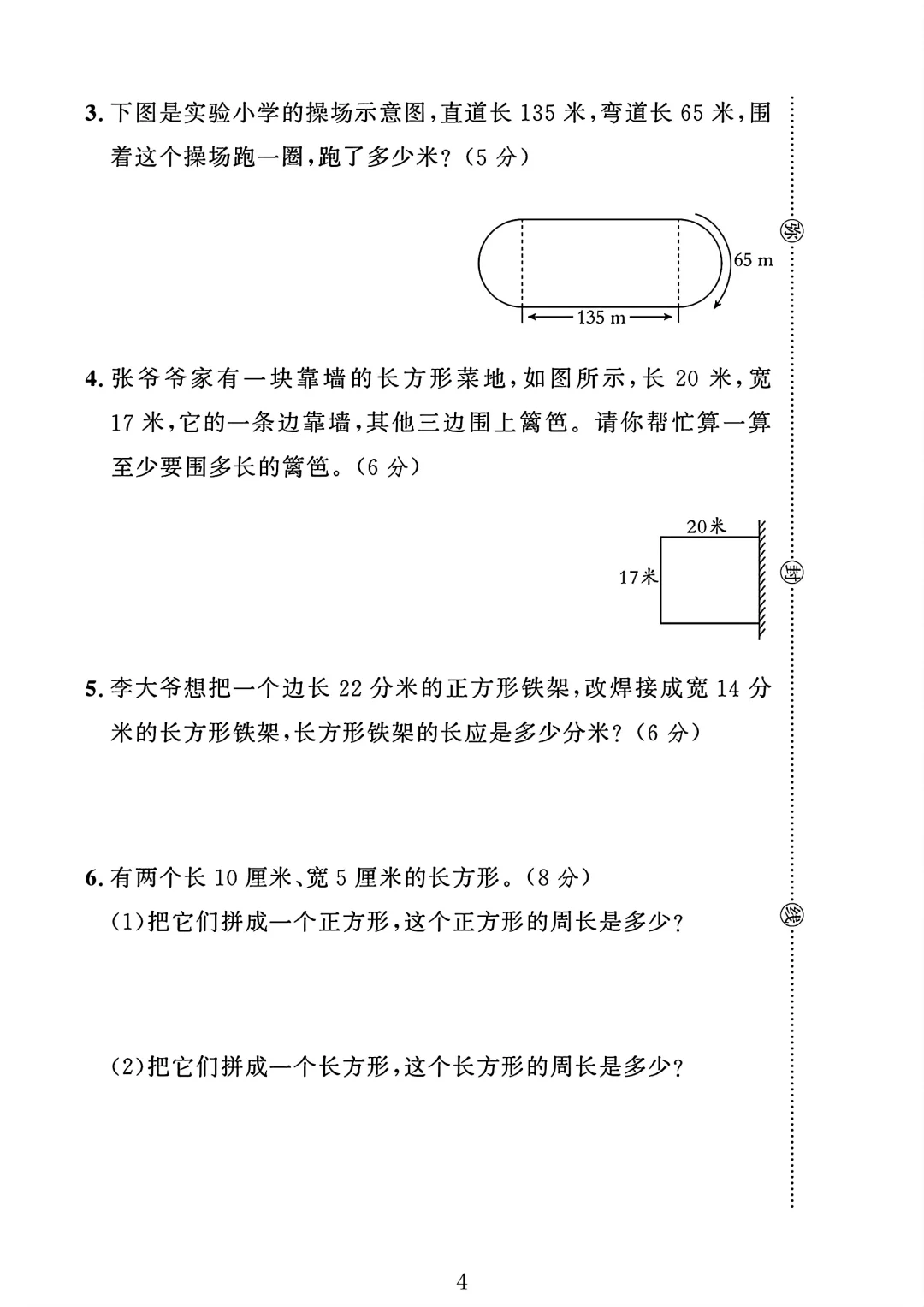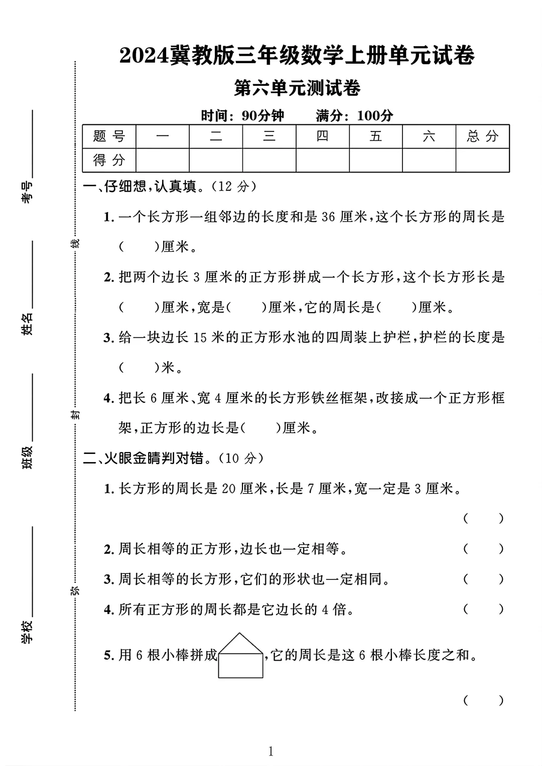 冀教版 三年级上册数学 第六单元 试卷 单元测试 电子版可打印