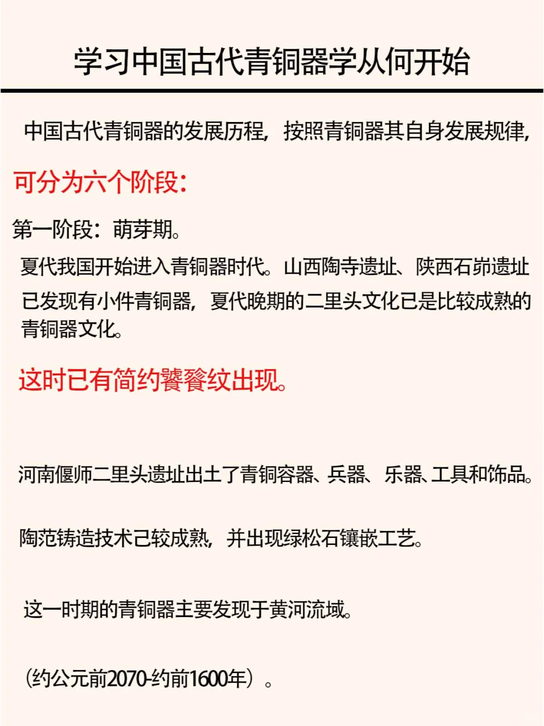 中国古代青铜器发展历程,按照其自身发展规律,可分为六个阶段: