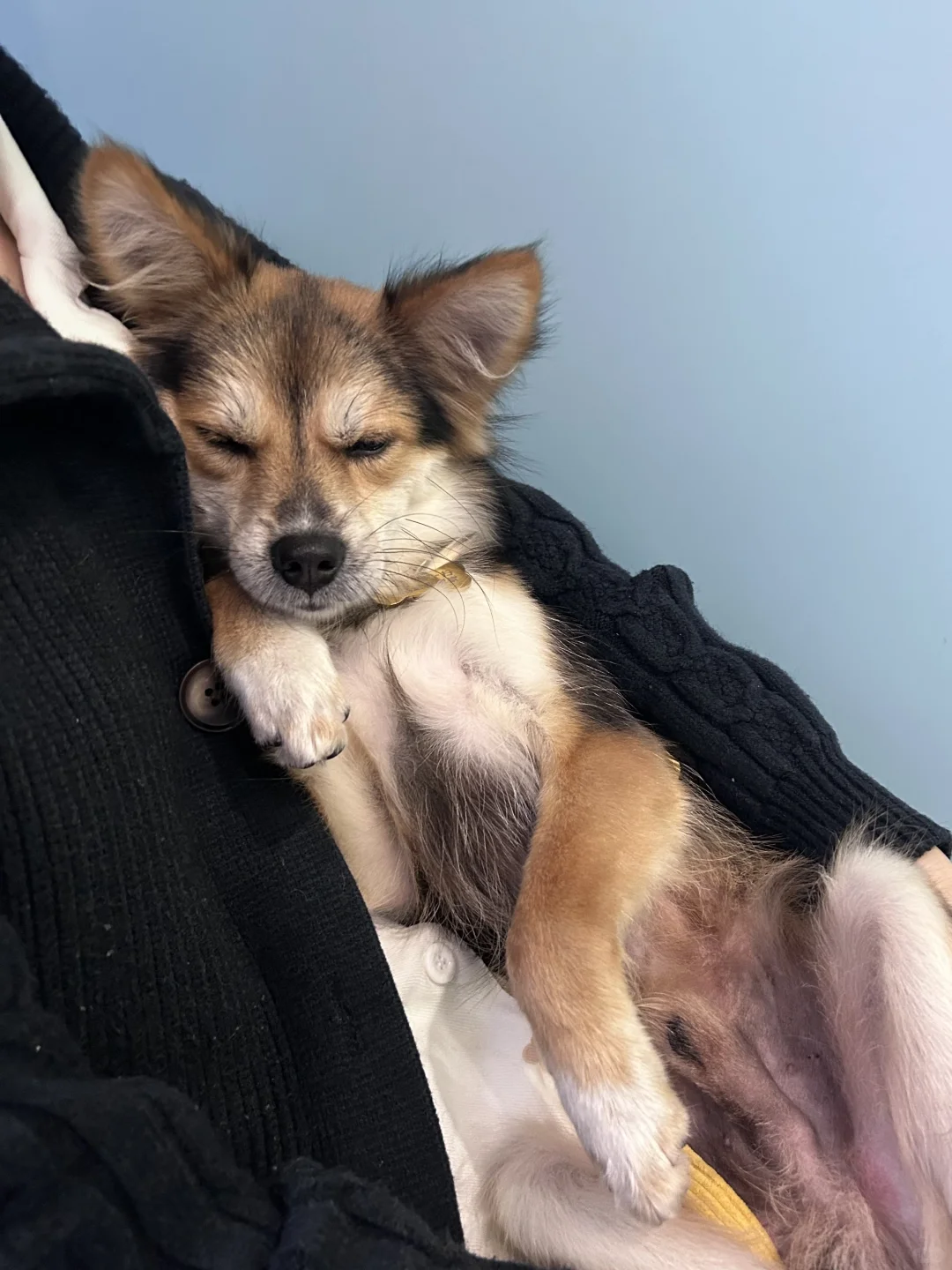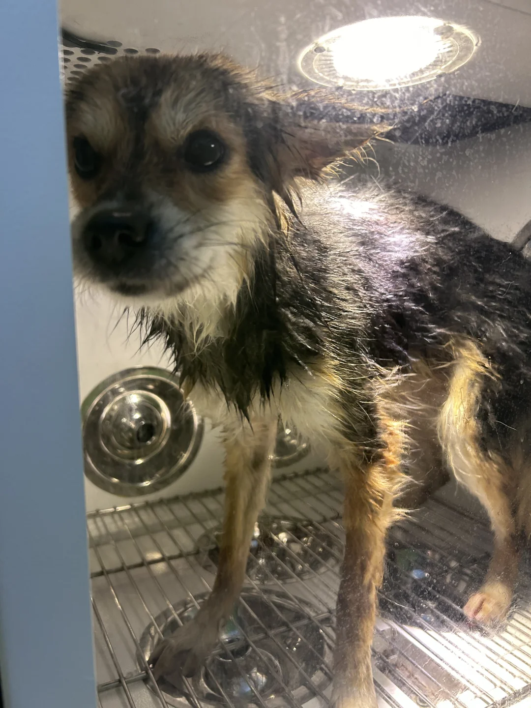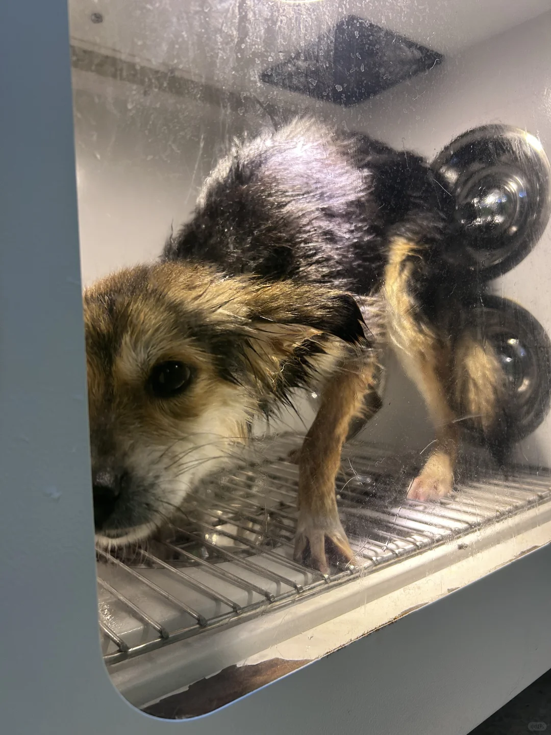 小黑因为下雨浑身都湿透了,落水狗一条还一直狂抖。女友给他洗了个热水澡,他吃了两碗狗粮又喝了一杯水然后在我怀里睡着了。